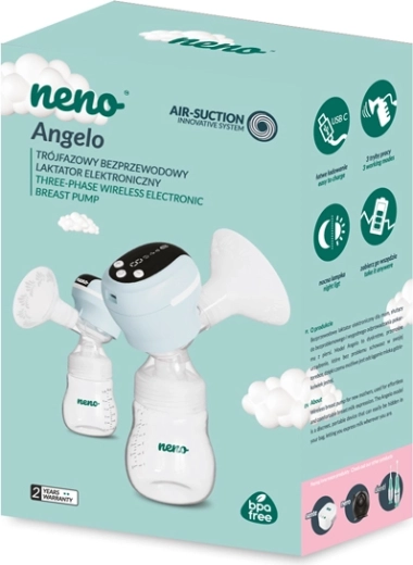 Bezdrôtová odsávačka materského mlieka Neno Angelo ponúka 3 účinné fázy odsávania (stimulačnú, hĺbkovú a zmiešanú Let-down) s 9 úrovňami intenzity v každej fáze. Je tichá, ľahká a prenosná, má dotykový displej, LED podsvietenie na nočné použitie a ochranu proti spätnému toku. Jemná silikónová vložka je šetrná k pokožke a zariadenie je bez BPA.