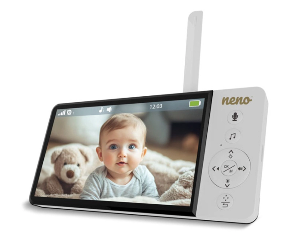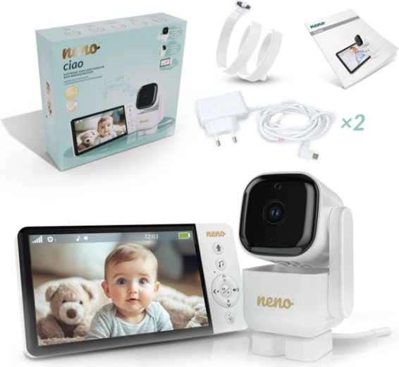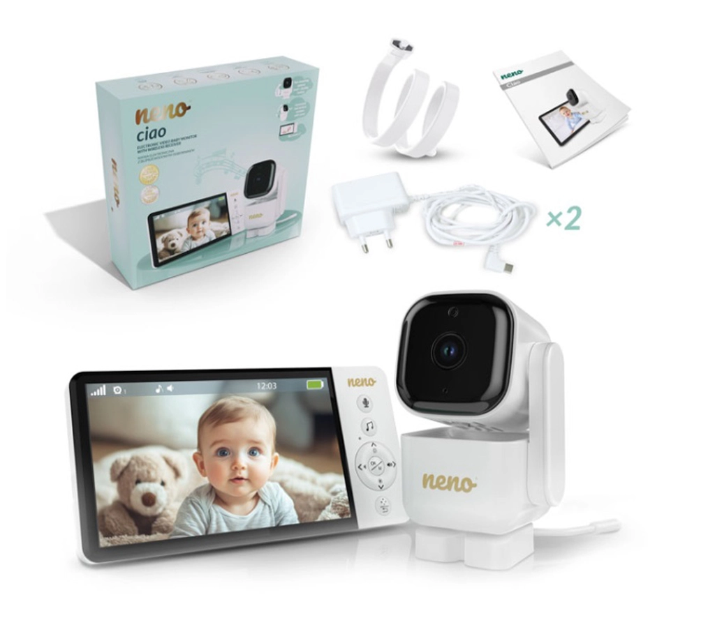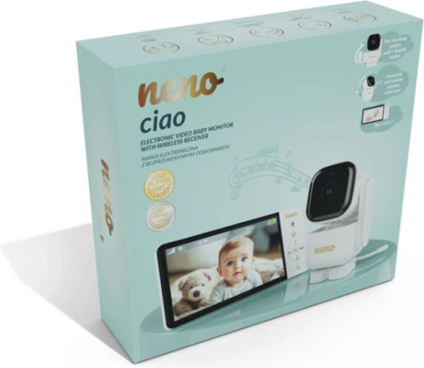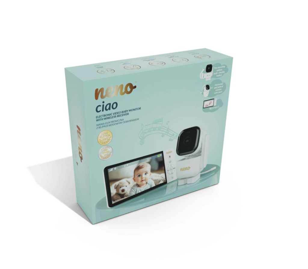 Inteligentná videopestúnka Neno Ciao vám zaistí pokoj vďaka 5" farebnému displeju, otočnej kamere Pan & Tilt (355°/90°), nočnému videniu, obojstrannej komunikácii a technológii VOX na úsporu energie. Vysielač má dosah až 300 m, snímač teploty, 8 upokojujúcich uspávaniek a výdrž prijímača až 12 hodín na vstavanú batériu 5000 mAh.