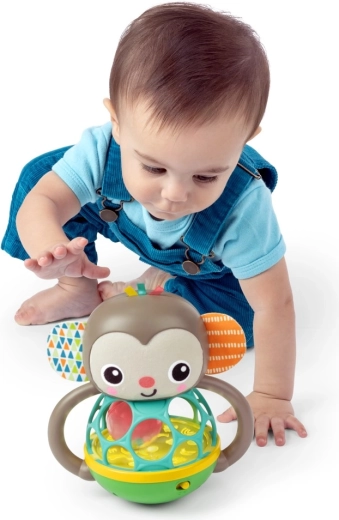 Roztomilá opička od BRIGHT STARTS s technológiou OBALL prináša deťom od 6 mesiacov množstvo zmyslovej zábavy. Vďaka ľahko uchopiteľným rukovätiam, hrkajúcim korálikom, svetelným efektom a viac než 20 zvukom a melódiám podporuje rozvoj jemnej motoriky, vnímanie príčiny a následku aj koordináciu ruka–oko. Kolísavá základňa aktivuje jednoduché zvuky a farebné svetlá, mäkké plyšové uši a saténové stužky lákajú k ďalšiemu skúmaniu.