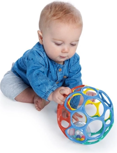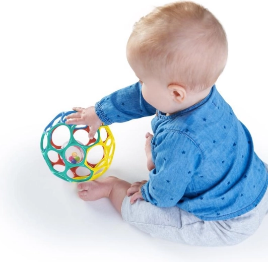 Farebná otvorená guľôčka s hrkálkou prináša vizuálnu aj zvukovú stimuláciu a rozvíja motoriku.