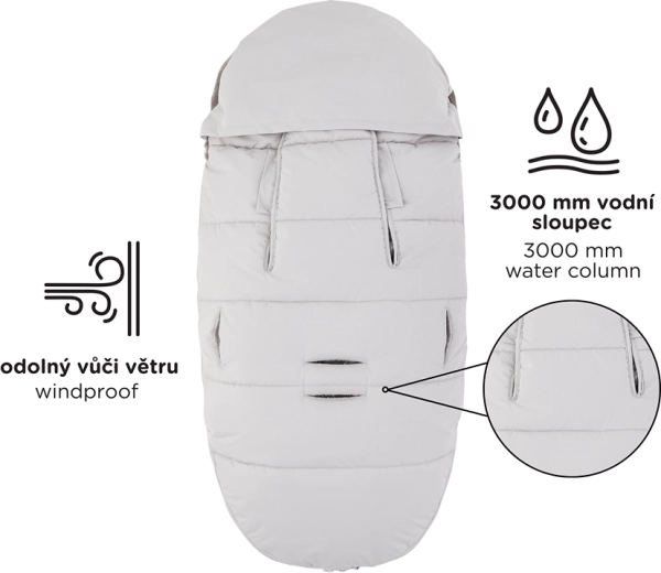 Špeciálna ekologická impregnácia bez škodlivých fluorokarbónov zabezpečuje vysokú odolnosť voči vode (3000 mm) aj vetru, aby dieťa zostalo v teple a suchu.