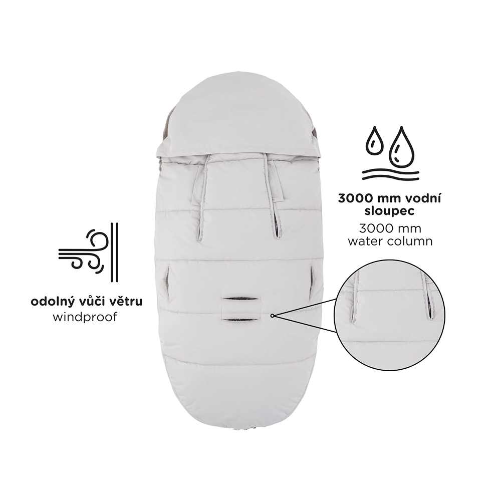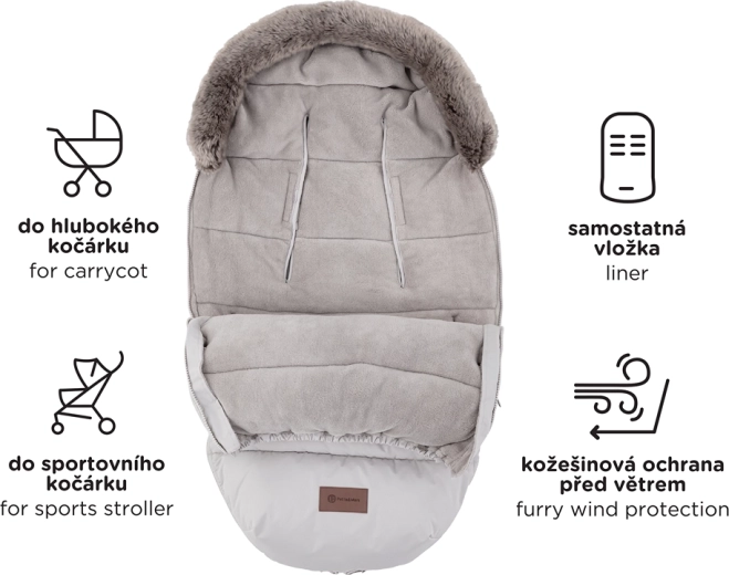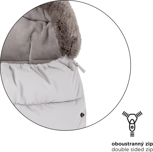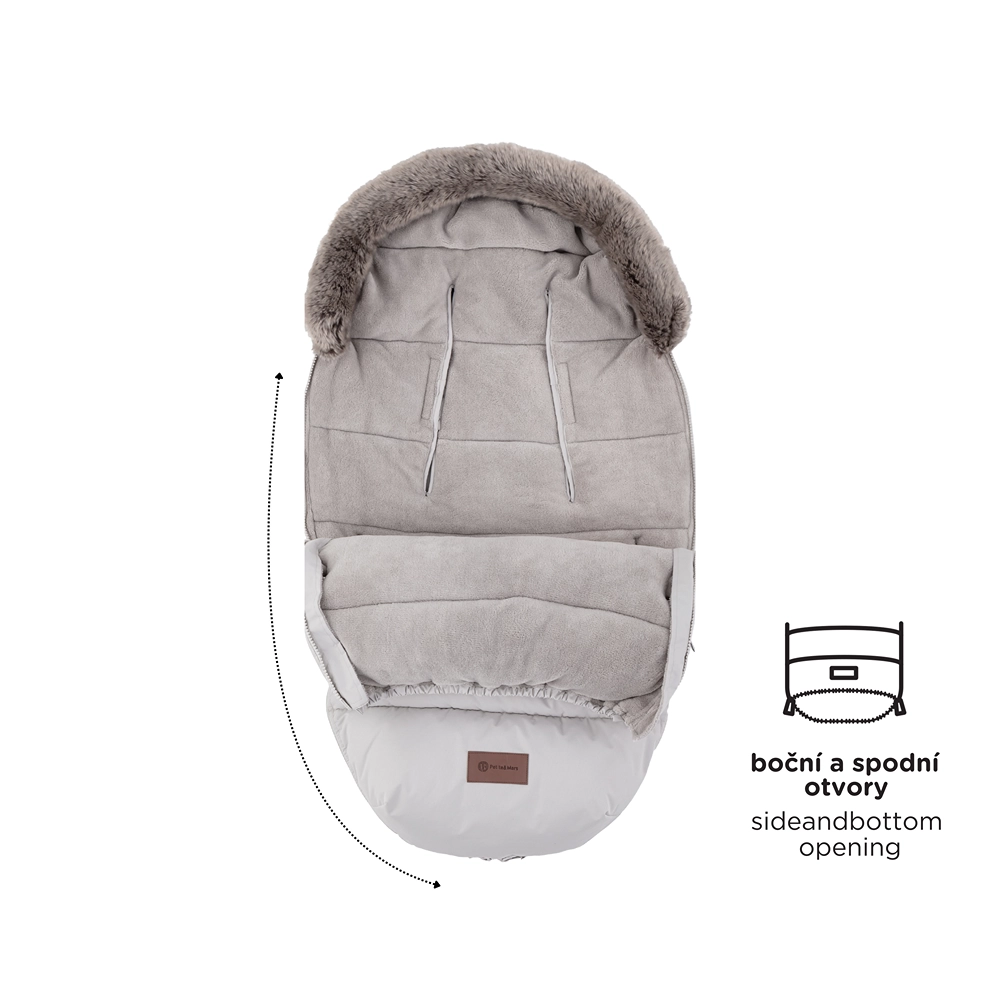 Premyslené celopostranné zipsy umožňujú plné odopnutie hornej časti, vetranie a vytvorenie samostatnej vložené podložky zo spodného dielu. V spodnej časti zipsy vytvárajú praktický otvor na nožičky. Inteligentné prehýbané protišmykové vrecko na zadnej strane pomáha držať fusak pevne na mieste a odnímateľná kožušina uľahčuje údržbu.