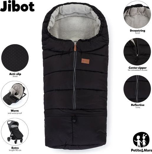 Fusak 3v1 PETITE&MARS Jibot Horizontal Ink Black je navrhnutý pre maximálny komfort detí od narodenia až do cca 3 rokov. Vďaka vodoodolnej a vetruodolnej vrchnej vrstve s vodným stĺpcom 1000 mm a mäkkej flísovej podšívke udrží vaše dieťa v teple a suchu aj pri zhoršenom počasí. Vodorovné otvory pre popruhy umožnia ľahké prevlečenie pásov bez nutnosti ich rozpojovania, čo zvyšuje kompatibilitu s kočíkmi a autosedačkami rôznych značiek.