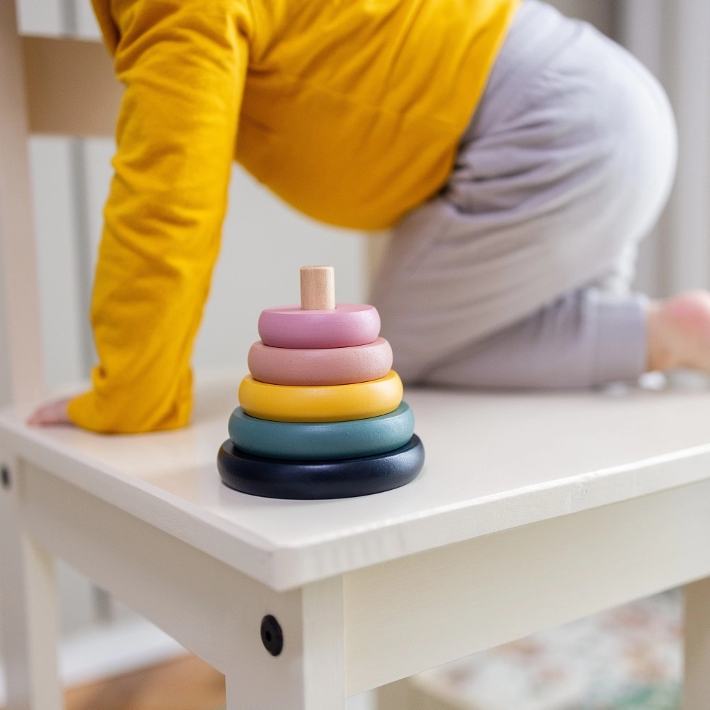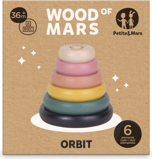 Drevená skladacia pyramída Orbit z kolekcie WOOD OF MARS prináša deťom zábavnú cestu k rozvoju zručností. Šesť farebných diskov sa ukladá na stabilný podstavec s kolíkom a prirodzene podporuje sústredenie, trpezlivosť a pochopenie veľkosti a postupnosti.