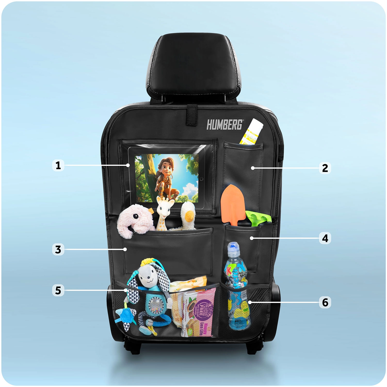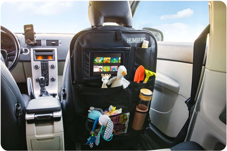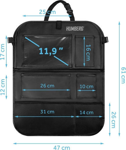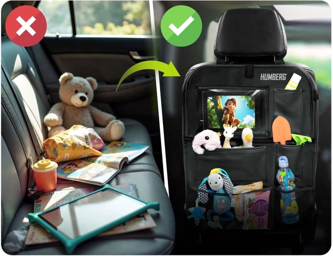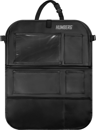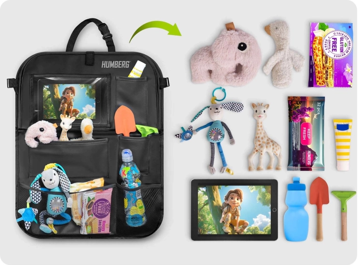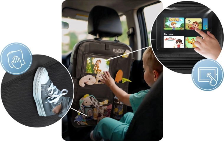 Udržiavajte auto prehľadné a cestovanie s deťmi pokojnejšie vďaka praktickému organizéru HUMBERG na zadnú stranu sedadla. Ponúka priehľadné vrecko na tablet s dotykovou fóliou, sklopný stolík na desiatu či kreslenie, držiak na fľašu a viac priestranných vreciek na hračky aj drobnosti. Jednoduchá montáž, materiál ľahký na čistenie a ochrana čalúnenia pred špinou od topánok.