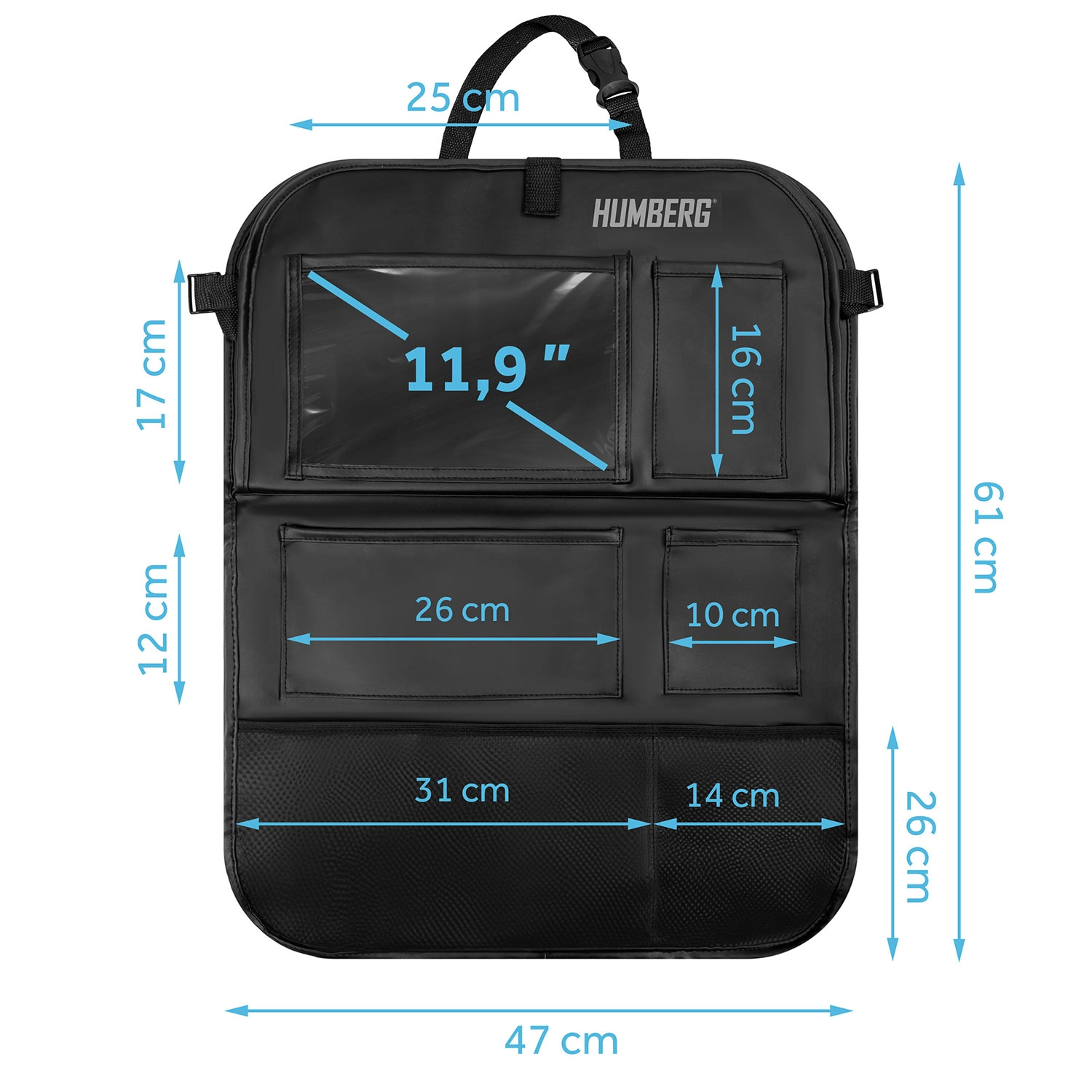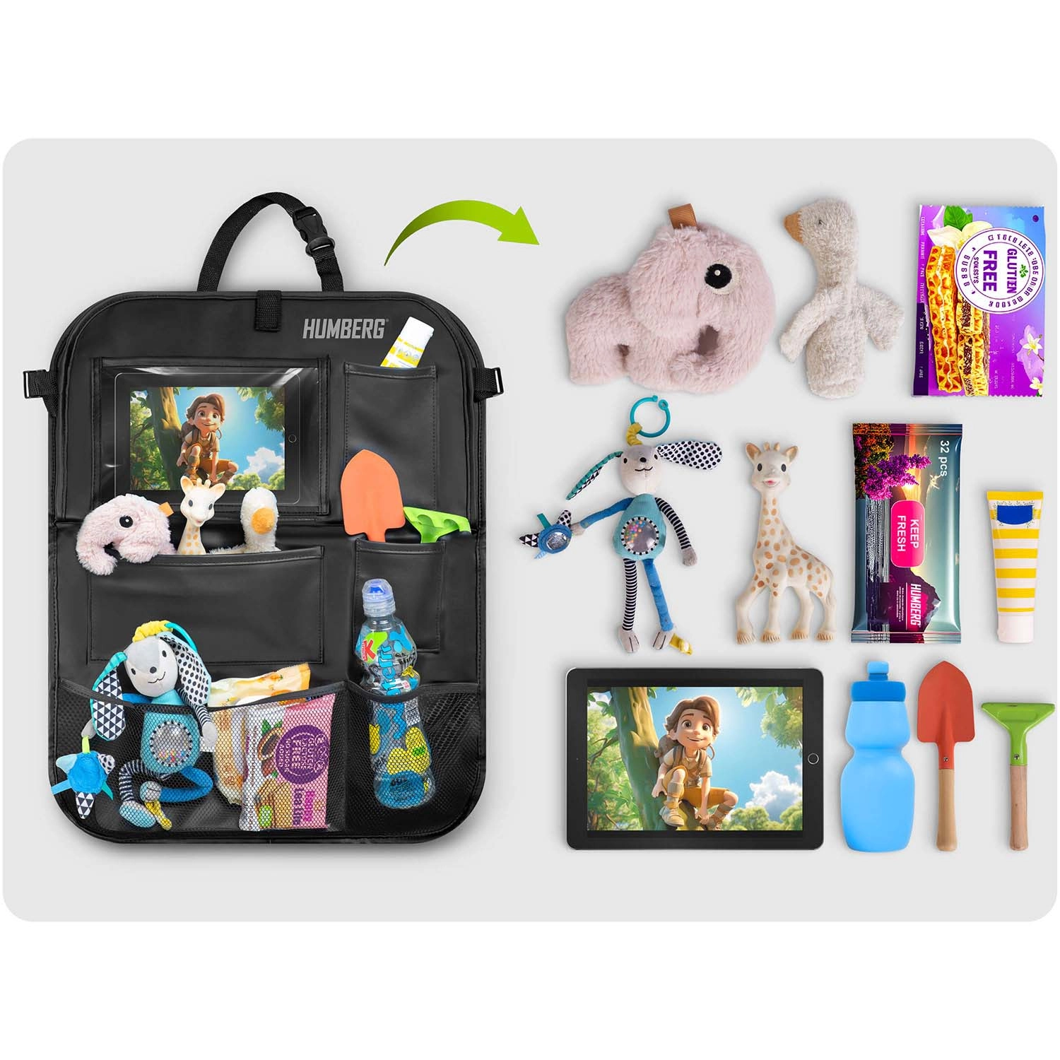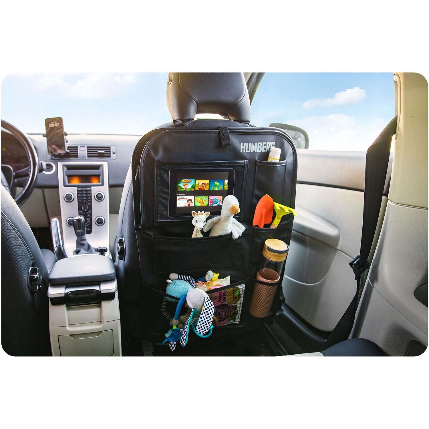 Udržiavajte auto prehľadné a cestovanie s deťmi pokojnejšie vďaka praktickému organizéru HUMBERG na zadnú stranu sedadla. Ponúka priehľadné vrecko na tablet s dotykovou fóliou, sklopný stolík na desiatu či kreslenie, držiak na fľašu a viac priestranných vreciek na hračky aj drobnosti. Jednoduchá montáž, materiál ľahký na čistenie a ochrana čalúnenia pred špinou od topánok.