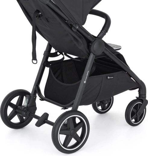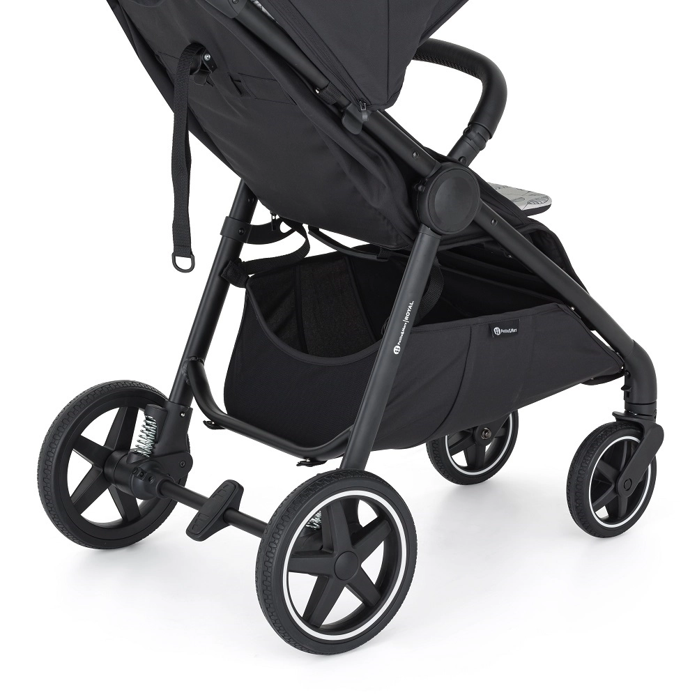 Celogumové kolesá so štýlovým bielym lemom a odpružením zaistia stabilnú jazdu aj na nerovnostiach a neohrozí ich defekt. Pevná hliníková konštrukcia, centrálna brzda a kvalitné úchyty kolies garantujú bezpečie, zatiaľ čo veľký nákupný košík a prebaľovacia taška uľahčia každodenné prechádzky. Kočík rastie s rodinou – striešku možno jednoducho vymeniť za inú farbu (kompatibilná s Royal2/Royal3).