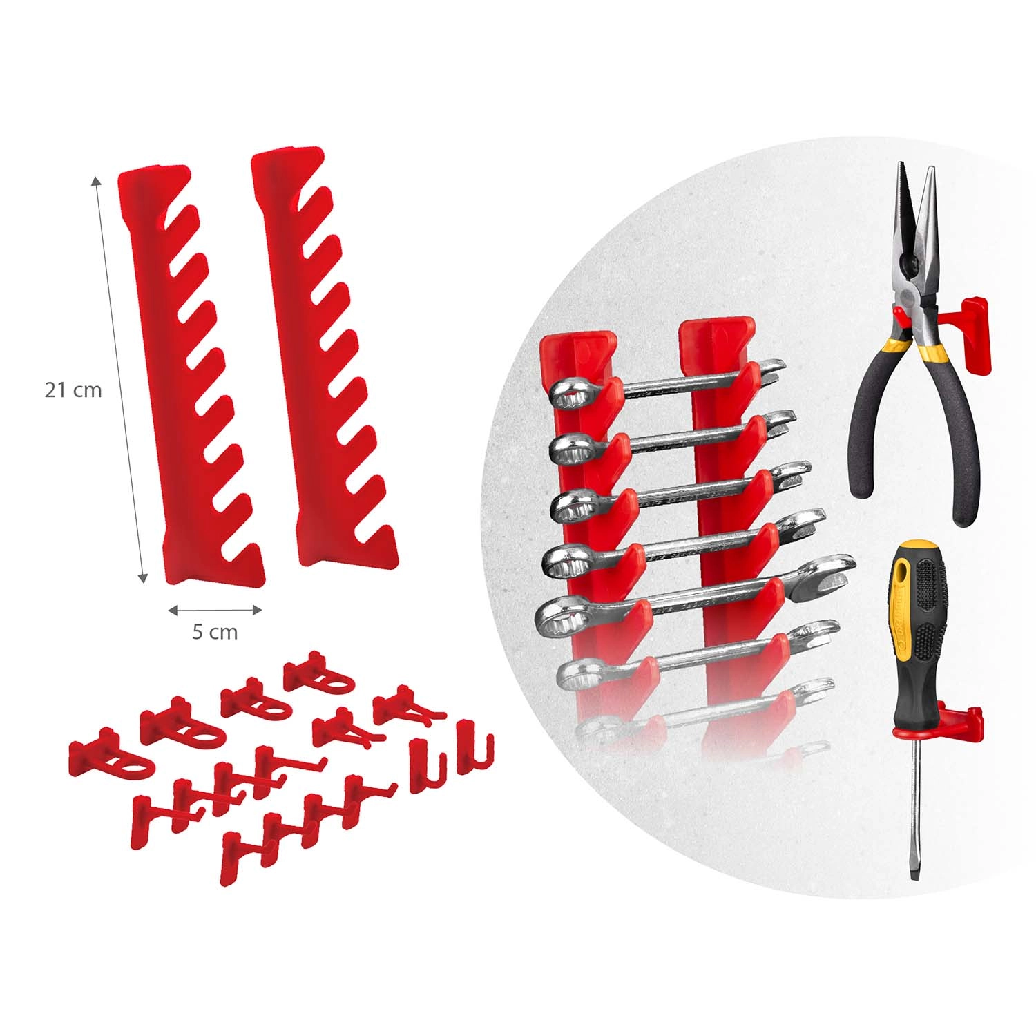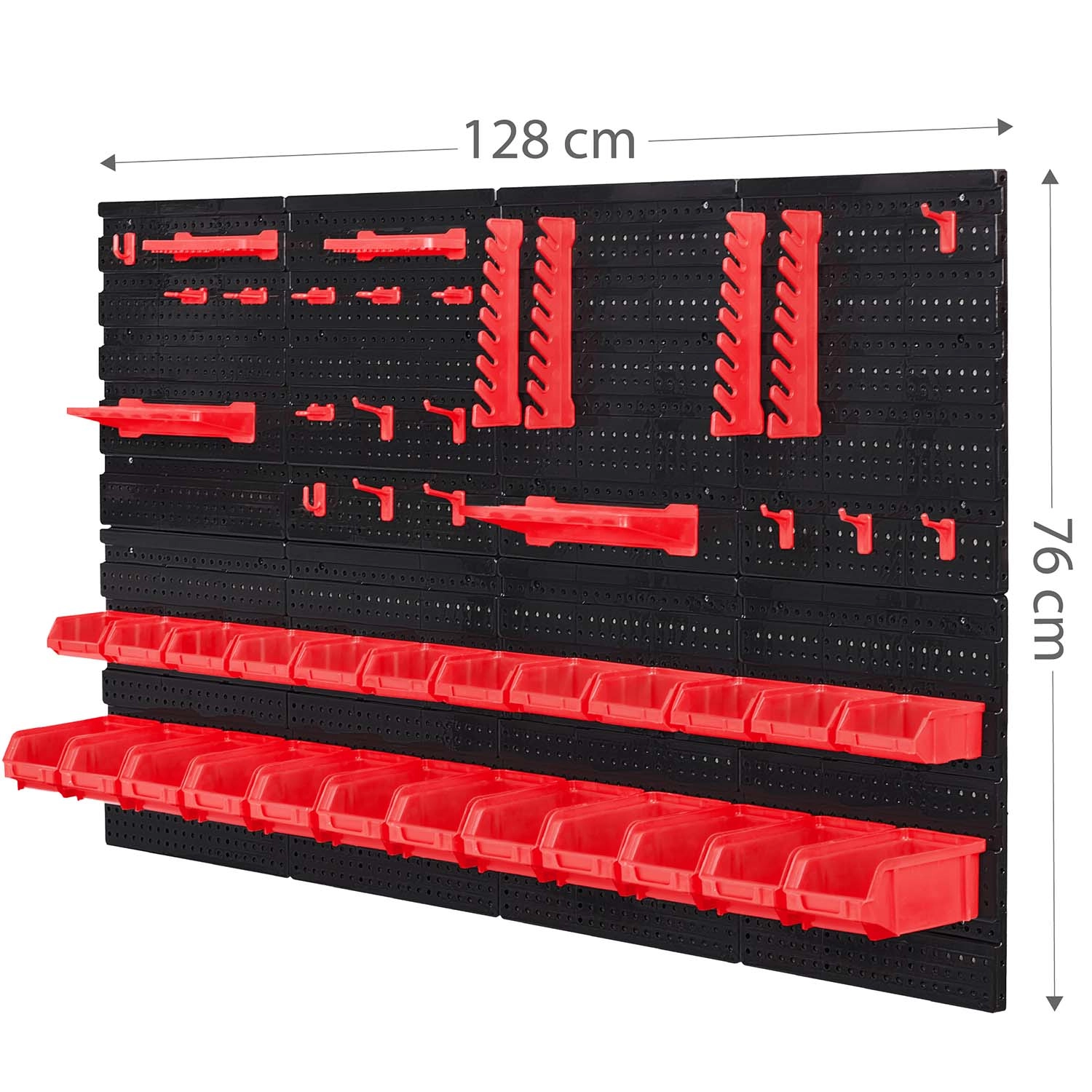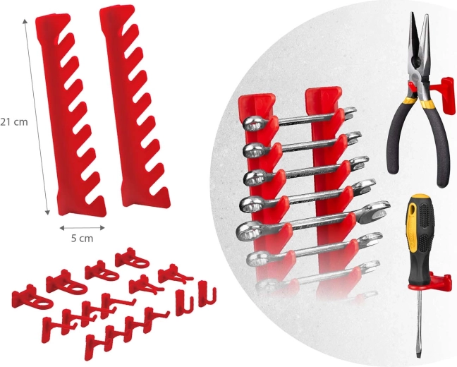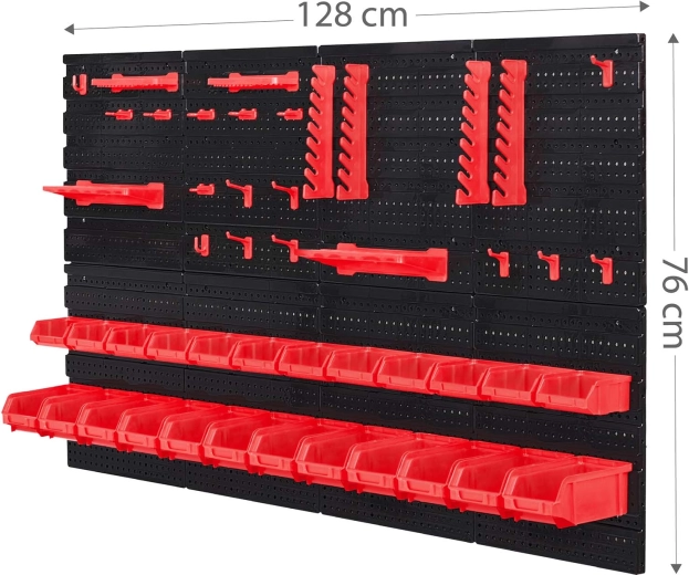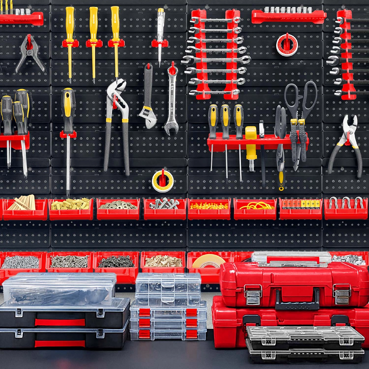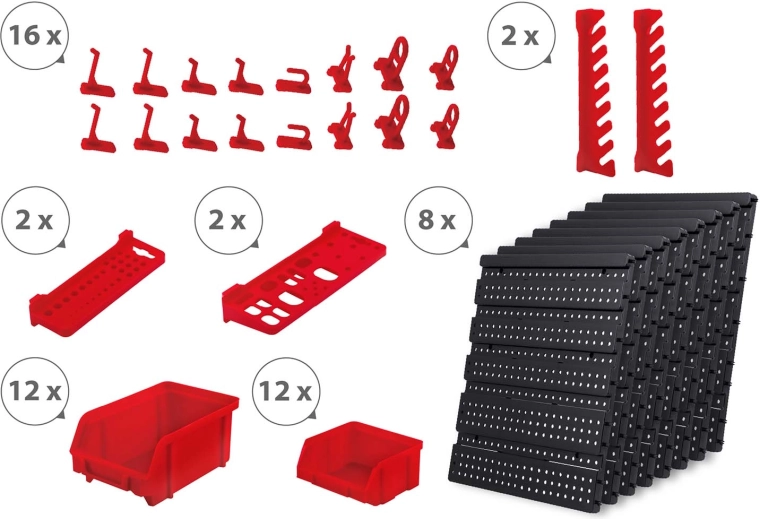 12 malých a 12 veľkých kôšikov na skrutky a vruty, 16 hákov a držiakov plus 2 držiaky na kľúče – ľahké triedenie a rýchly prístup.