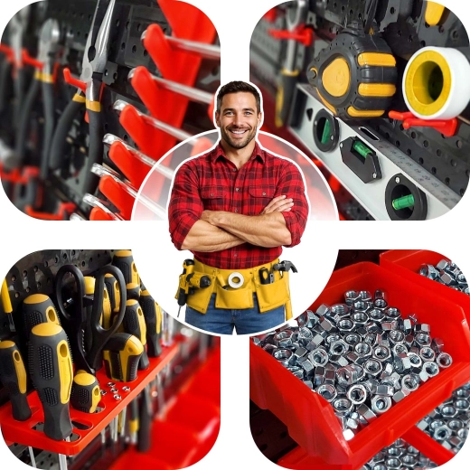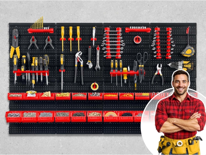 Modulárny systém pegboard panelov HUMBERG premení každý priestor na dokonale organizované pracovisko. Kombinácia všestranných háčikov a držiakov, kôšikov dvoch veľkostí a praktických políc zaistí, že budete mať skrutkovače, kliešte, bity, vrtáky aj spojovací materiál vždy poruke. Robustné perforované panely znesú každodenné používanie a vďaka inteligentnému skladaniu prvkov si tabuľu ľahko prispôsobíte svojim návykom.