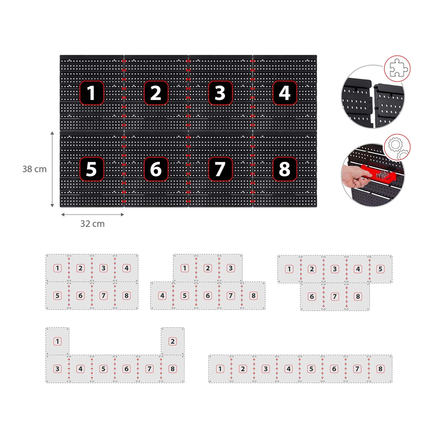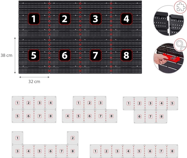 Obsah sady: 6 modulárnych panelov, 12 malých kôšikov (9,5 × 10 × 5 cm), 12 veľkých kôšikov (16 × 10 × 7,3 cm), 2 police 23 × 9 cm, 2 police 17 × 5 cm, 16 držiakov a hákov, 2 držiaky na kľúče a montážne hmoždinky pre rôzne povrchy (betón, tehla, drevo, plech). Montáž je rýchla a intuitívna – prvky jednoducho nacvaknete do perforácie a kedykoľvek preusporiadate.
