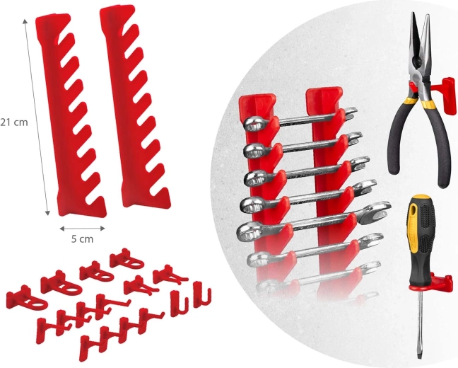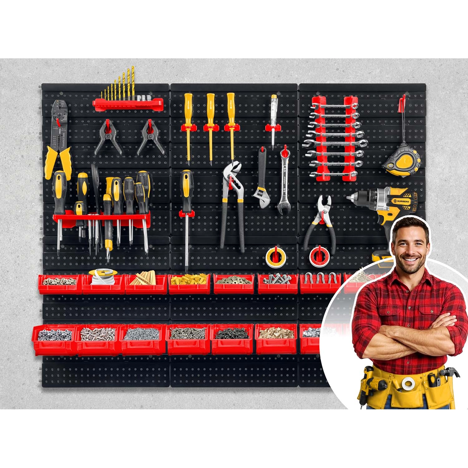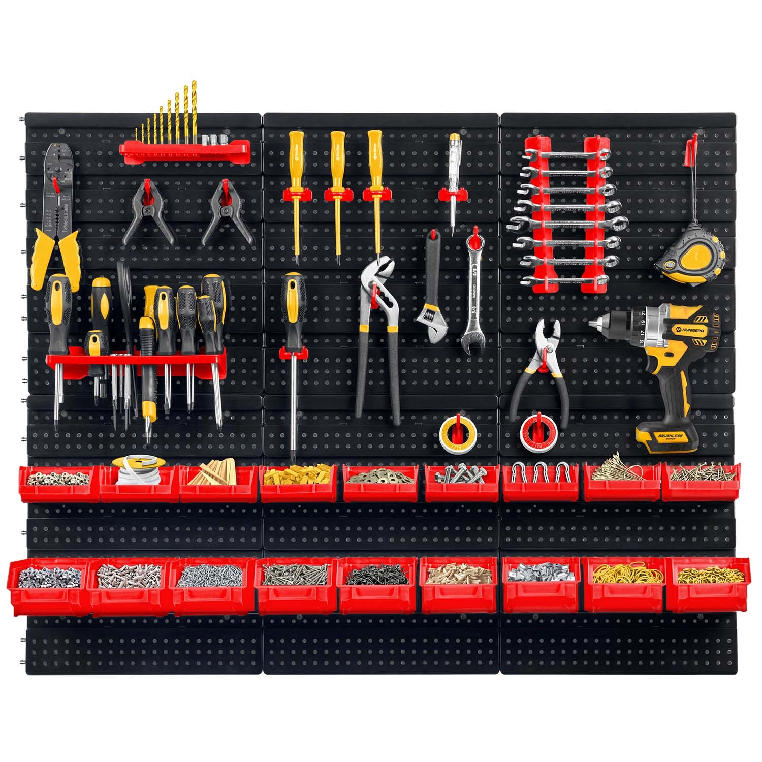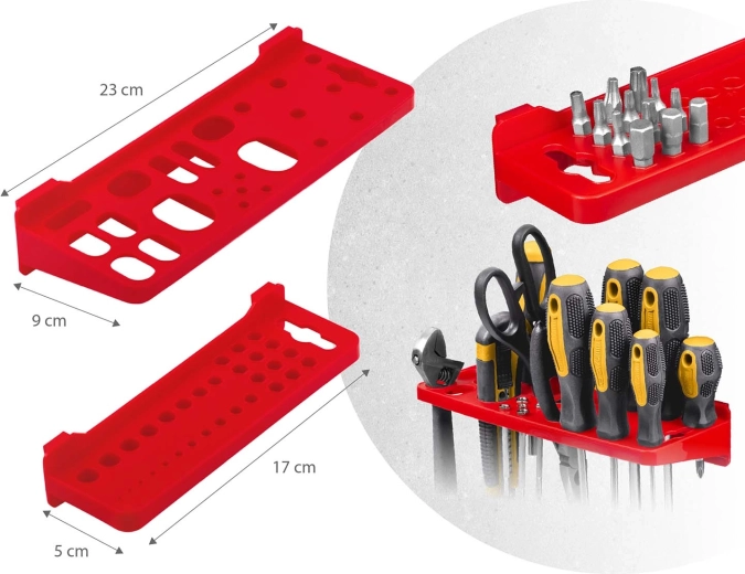 Kompletný nástenný organizér HUMBERG je nepostrádateľný pomocník pre každý servis aj domácu garáž. Vďaka modulárnemu systému perforovaných panelov si ľahko poskladáte rozvrhnutie presne podľa svojich potrieb. Pevné háčiky, držiaky a police udržia skrutkovače, kliešte aj kľúče, zatiaľ čo rôzne veľkosti kut prehľadne roztriedia spojovací materiál.