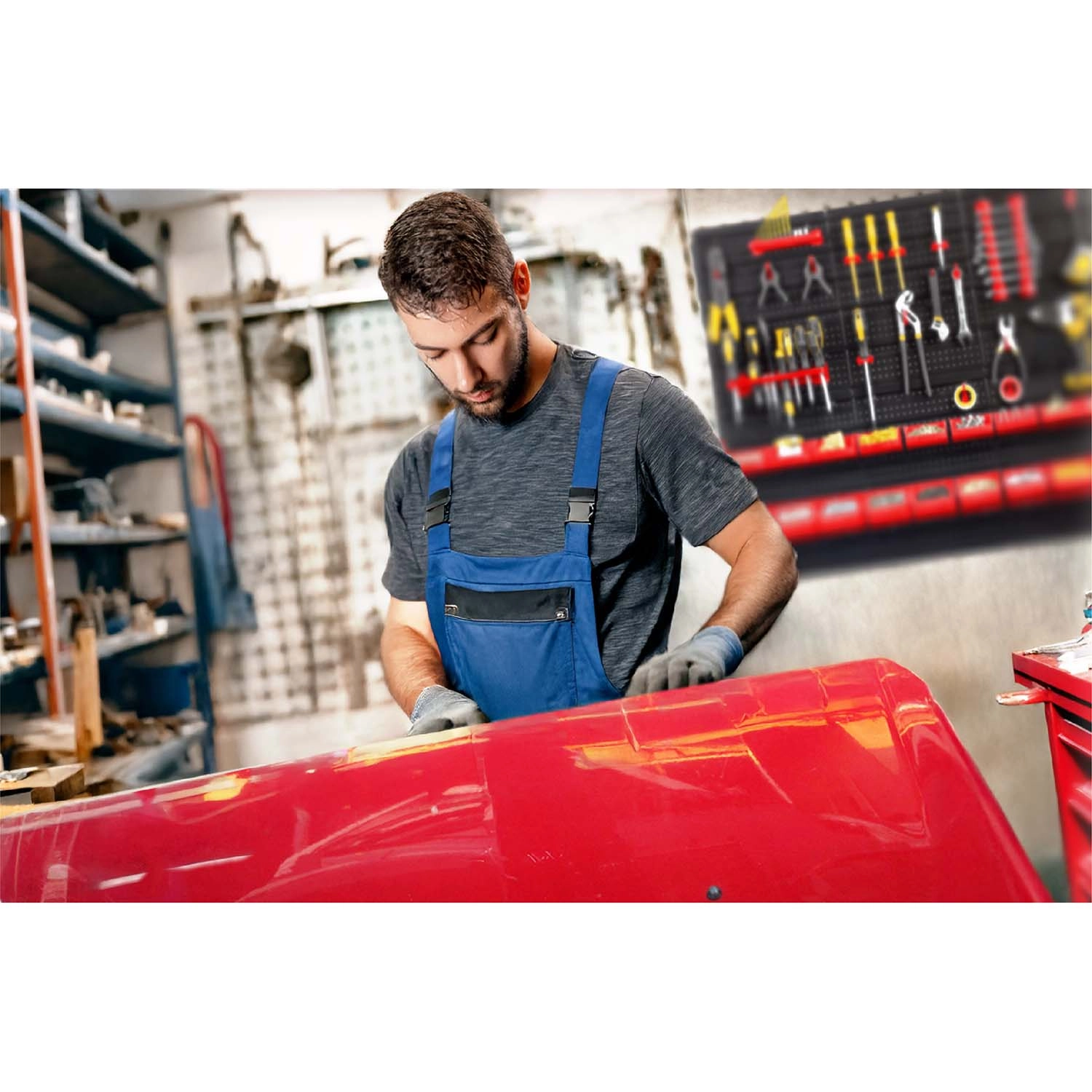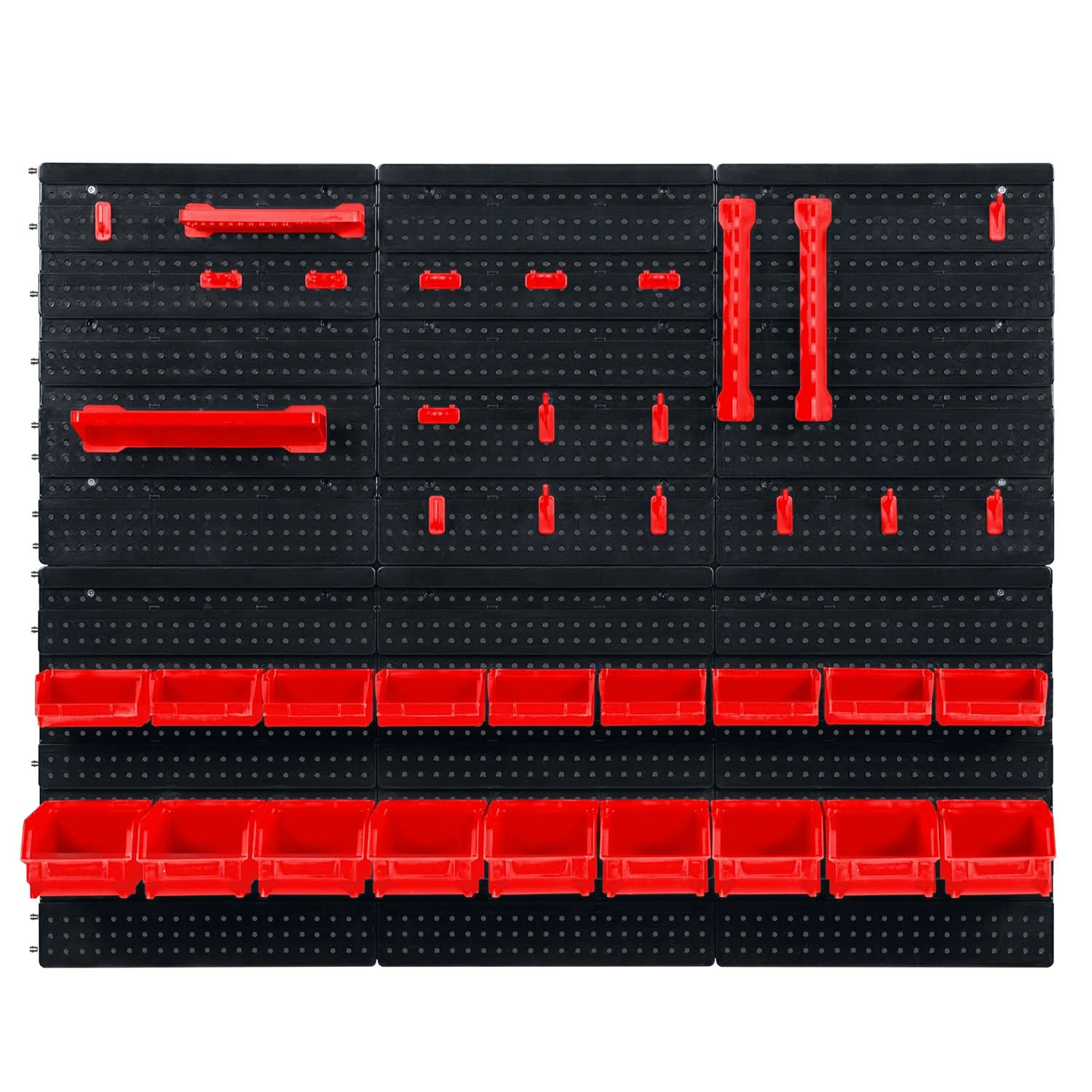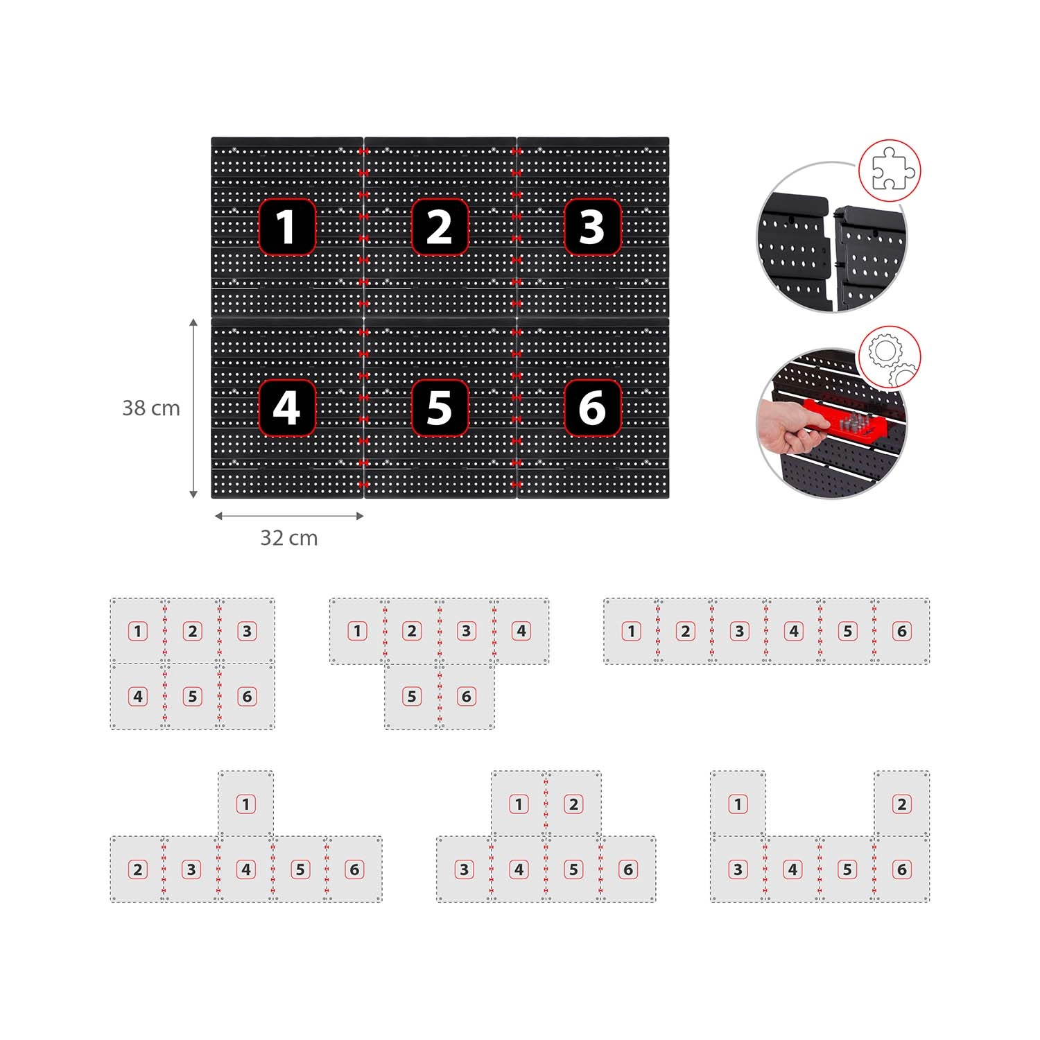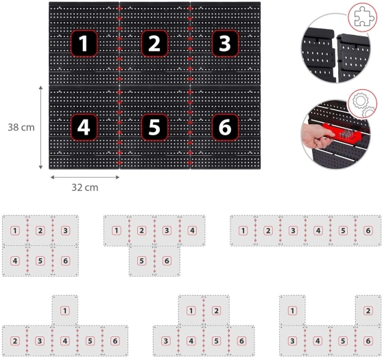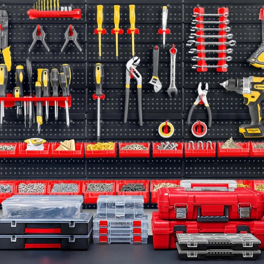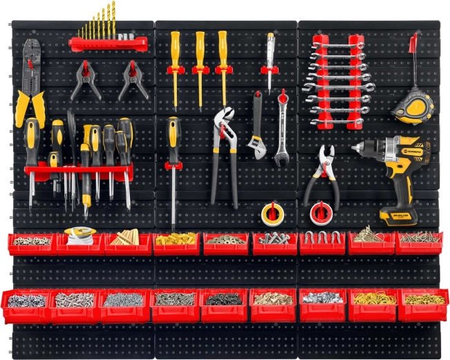 Šesť perforovaných panelov a 43 doplnkov vám umožní usporiadať náradie presne podľa vašich zvyklostí – od klieští a skrutkovačov až po vrtáky a bity.