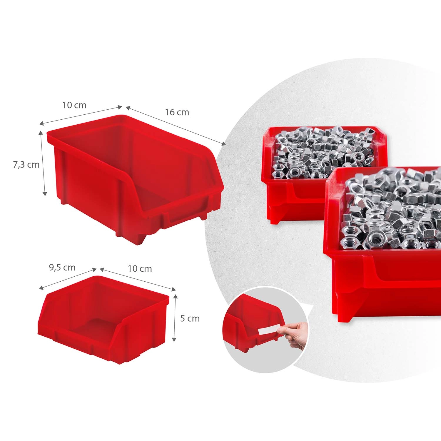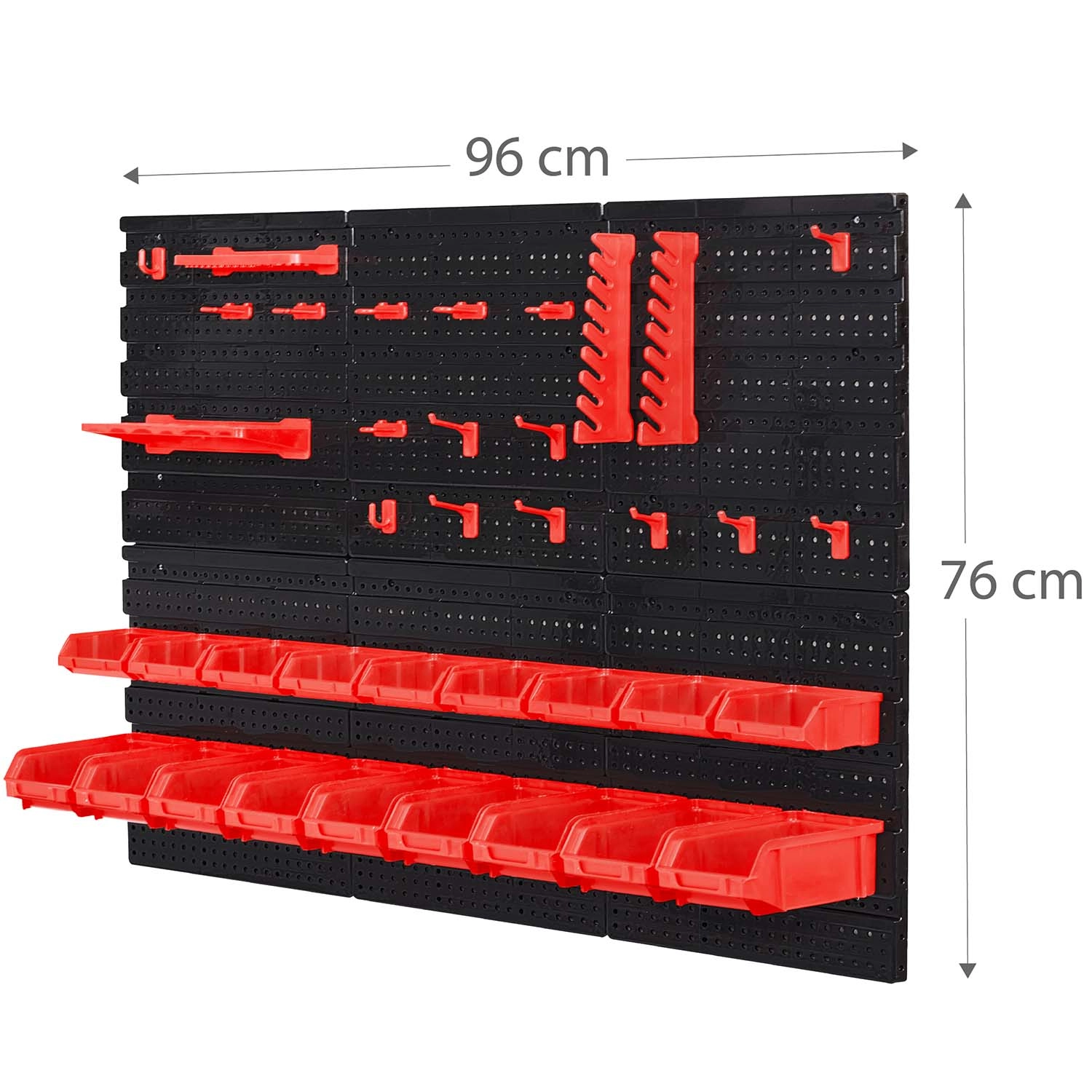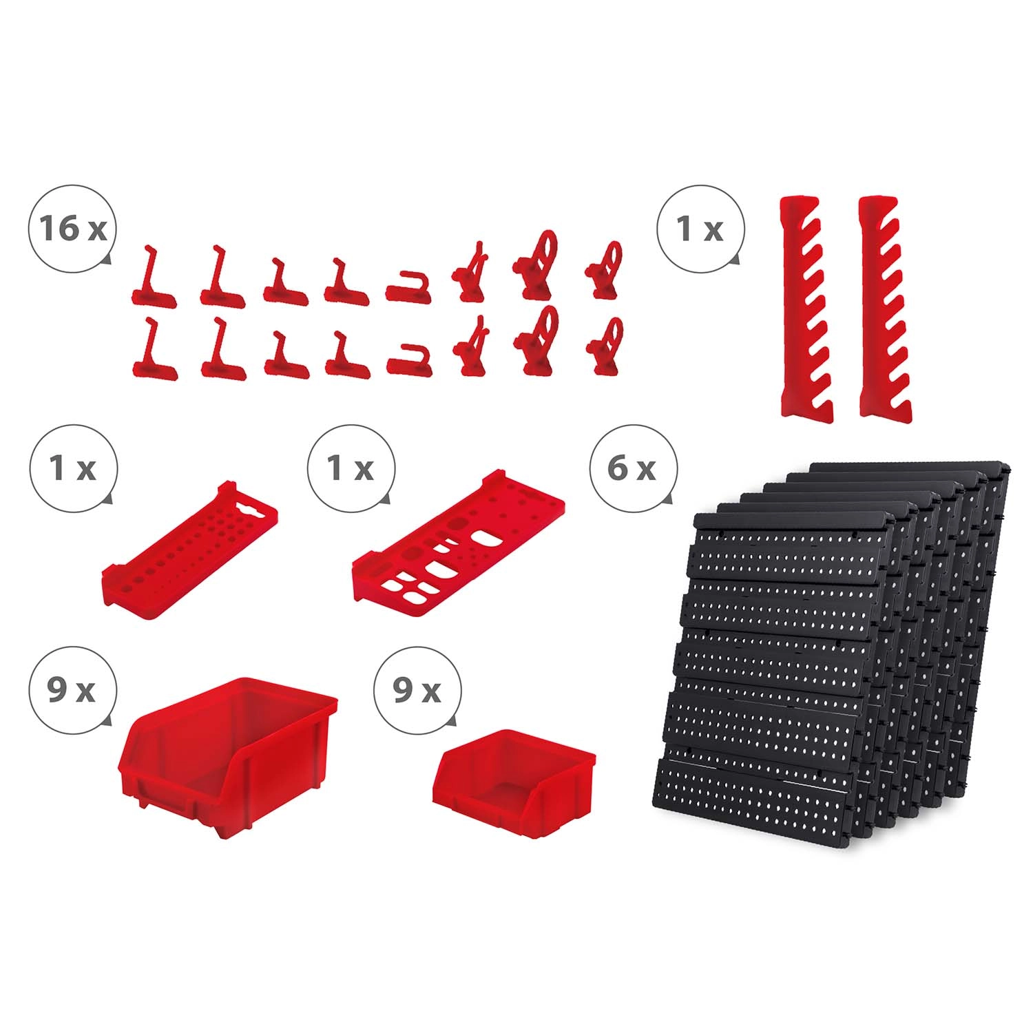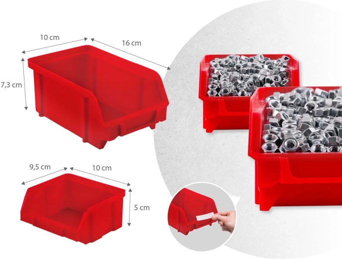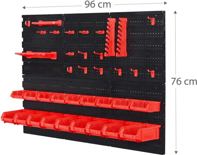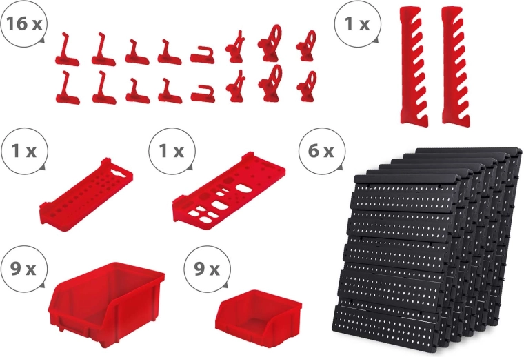 18 kut vo dvoch veľkostiach, dve odkladacie police a sada háčikov a držiakov zabezpečia prehľadné triedenie spojovacieho materiálu aj bezpečné uloženie náradia.