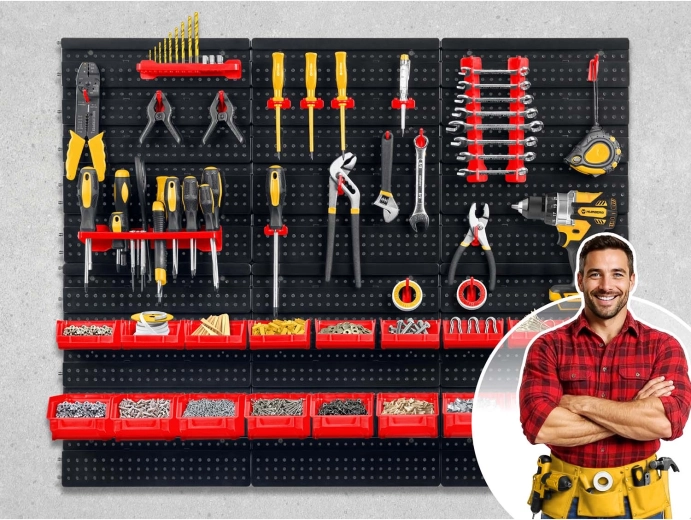 Udržte si vo svojej dielni dokonalý poriadok s nástennou tabuľou na náradie HUMBERG s rozmermi 96 × 76 cm. Modulárne panely, až 43 praktických doplnkov (kuty, háčiky, police a držiaky) a pevné perforované dosky zabezpečia prehľadné uloženie skrutiek, bitov aj ručného náradia. Jednoduchá montáž, voľné rozmiestnenie príslušenstva a odolné materiály zaručujú dlhú životnosť doma aj v profesionálnom servise.
