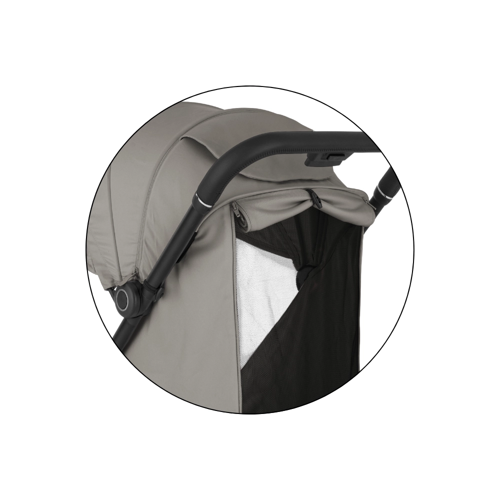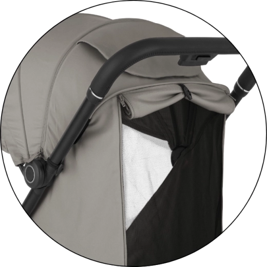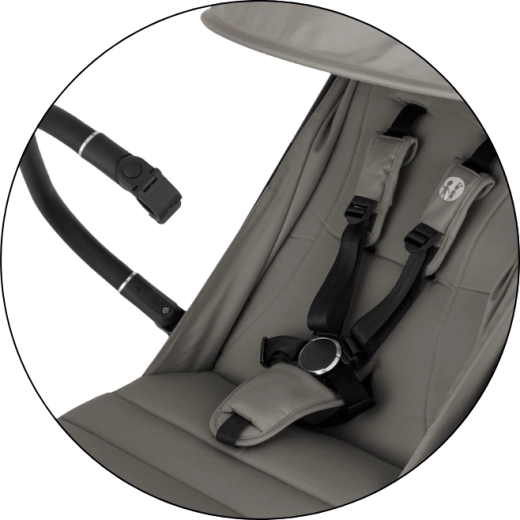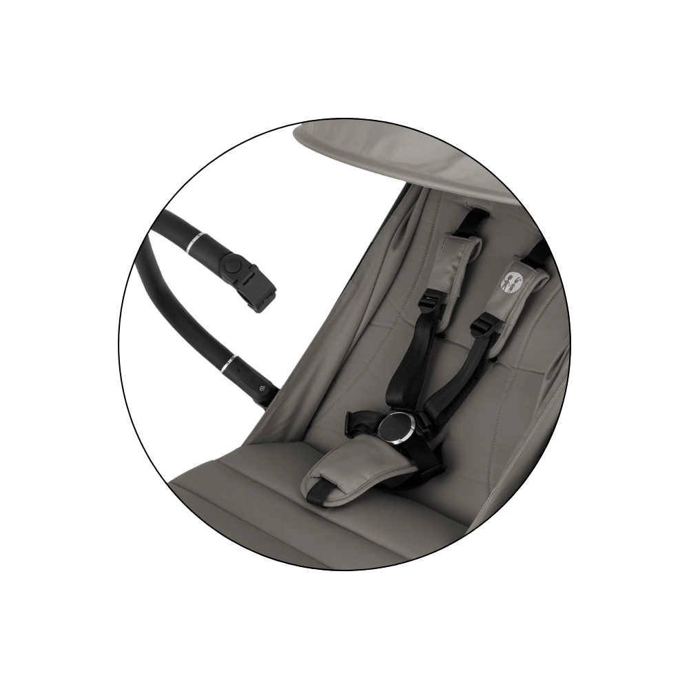 Dieťaťu dopraje pohodlie pri dlhších výletoch: priestranné sedadlo (šírka 33–37 cm) a odvetraná opierka chrbta s nastavením až do úplného ľahu podporujú zdravý odpočinok. Rozšíriteľná strieška s UPF50+ a tiché magnetické okienko chránia a umožnia nerušený dohľad. 5-bodový pás s magnetickou prackou zaistí rýchle a bezpečné pripútanie.