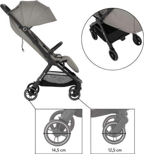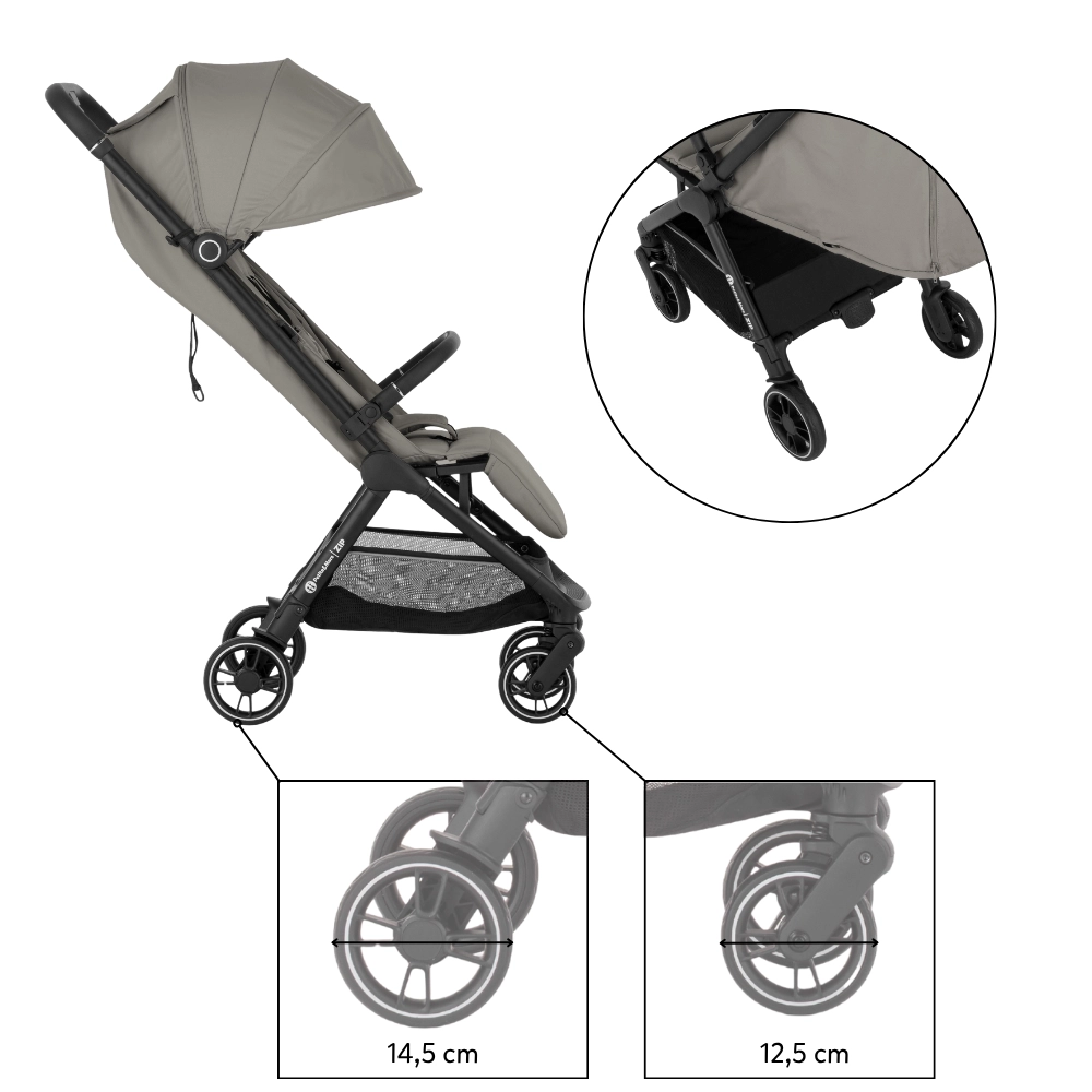 Odpružené EVA kolesá a kompaktný rám uľahčujú manévrovanie po chodníkoch a parkových cestičkách. Lanková brzda neprekáža pri chôdzi.