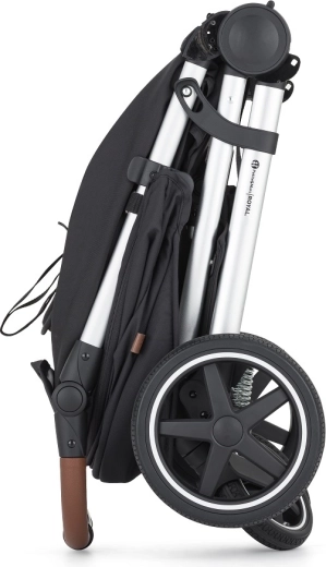 Rukoväť a madlo z hnedej eko-kože, veľký košík, nánožník a prebaľovacia taška v balení. Skladanie jednou rukou dovnútra udrží poťahy čisté.