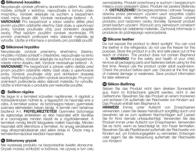 Vyrobené z odolného potravinárskeho silikónu bez BPA, ktorý je šetrný k citlivým detským ďasnám a zároveň dostatočne pružný na pohodlné žuvanie. Pre extra úľavu ho môžete zchladiť v chladničke (nie v mrazničke). Údržba je jednoduchá – možno umývať v umývačke riadu.