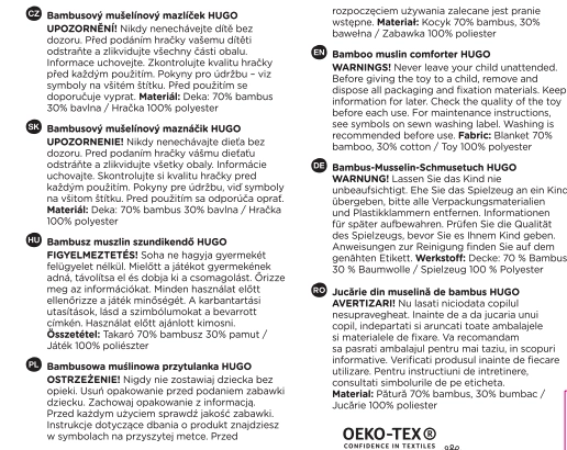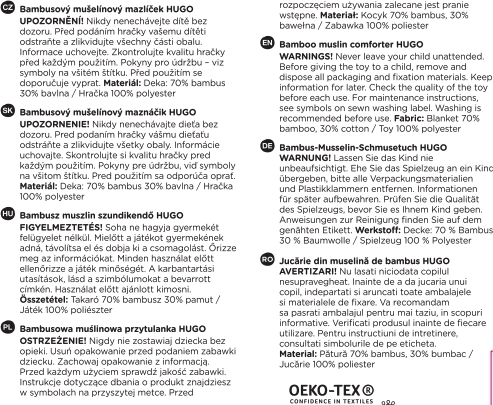 Bambusový mušelín je prirodzene hypoalergénny, antibakteriálny a odolný voči zápachu. Má termoregulačné vlastnosti – v lete príjemne chladí a v zime hreje. V hlavičke je ukrytá jemná hrkálka, ktorá bábätko zaujme, ale neruší. Materiál spĺňa Oeko‑Tex Standard 100, takže je bezpečný pre citlivú detskú pokožku.