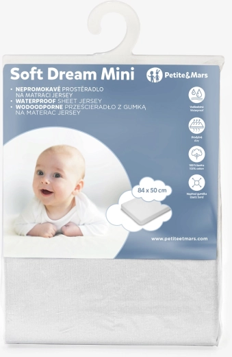 Nepremokavá napínacia plachta PETITE&MARS Soft Dream Mini je ideálnou voľbou pre menšie postieľky. Kombinuje jemný 100 % bavlnený jersey pre pohodlie bábätka a ochranu matraca pred vlhkosťou. Vďaka pružnej gumičke po obvode drží na mieste, nezhŕňa sa a postieľka vyzerá vždy upravene.