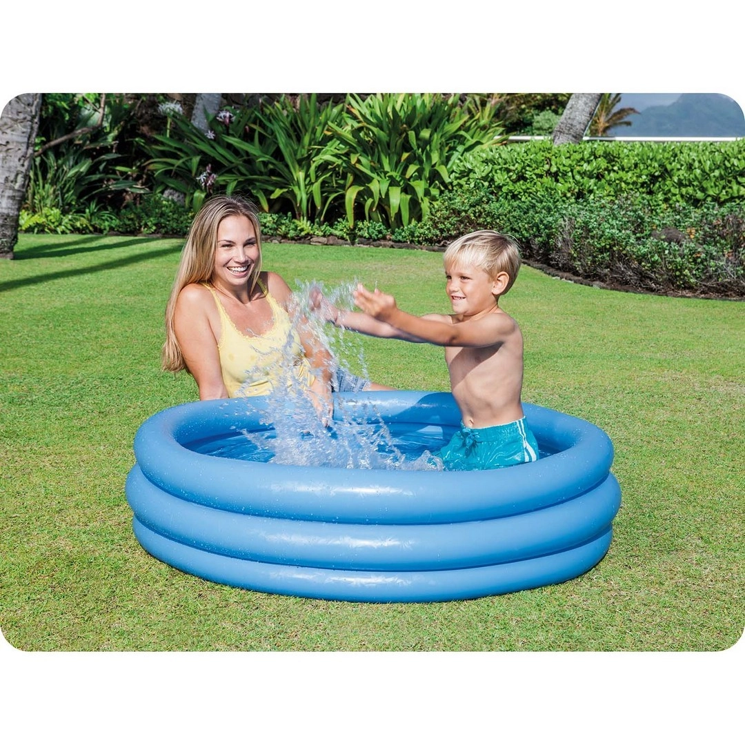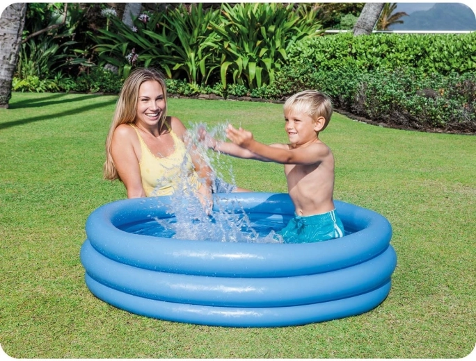 Modrý nafukovací bazénik Intex s rozmermi 114 × 25 cm je ľahký, bezpečný a ideálny na letné osvieženie detí. Má tri nafukovacie prstence pre stabilitu, je vyrobený z odolného PVC a ponúka objem 156 l pri výške hladiny 18 cm. Súčasťou je opravná záplata, takže zábava môže pokračovať bez starostí.