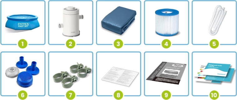 - Filtračné čerpadlo, krycia plachta, filter H, hadice, sitká, spony, opravná záplata, návod