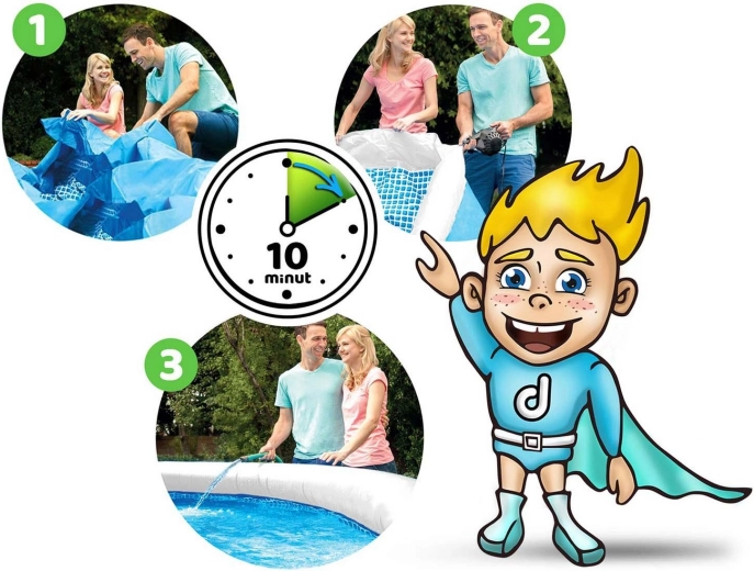 - Jednoduchá inštalácia – rozvinúť, nafúknuť lem, napustiť vodu.