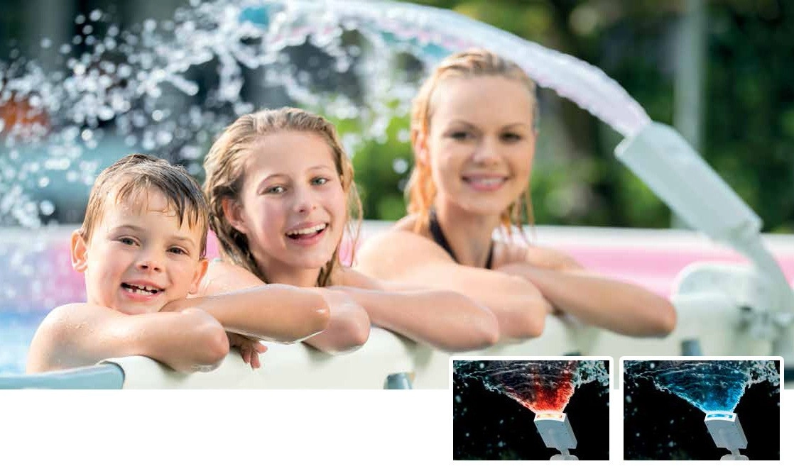Premeňte svoj záhradný bazén na atraktívnu oázu svetla a pohybu. LED sprška INTEX využíva energiu z prietoku vody, takže funguje bez napájania a bez batérií. Farebné osvetlenie rozžiari kaskády vody a vytvorí jedinečnú atmosféru pre rodinnú relaxáciu aj večerné kúpanie.