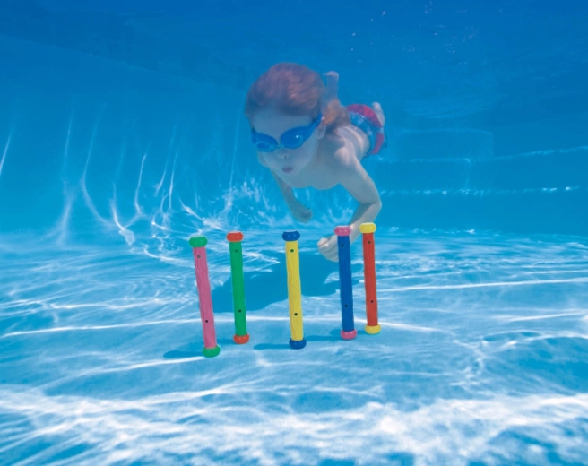 Každá tyčinka je zaťažená, takže po vhodení do vody rýchlo klesne na dno a zostane stáť vertikálne. Deti tak môžu ľahko trénovať potápanie, orientáciu pod vodou aj koordináciu pohybov.