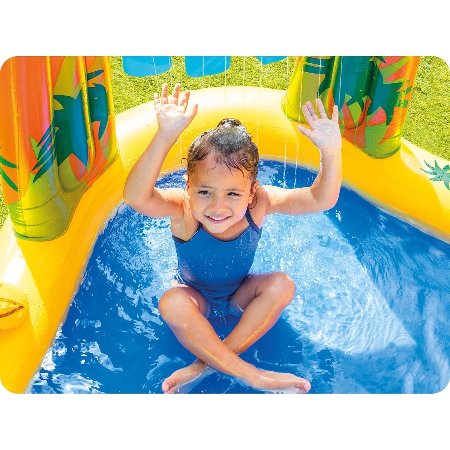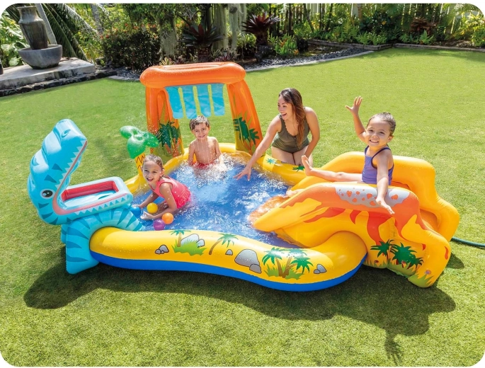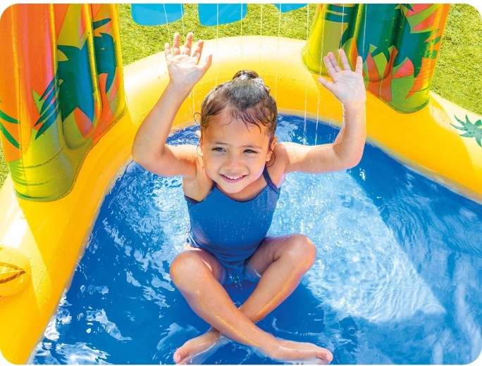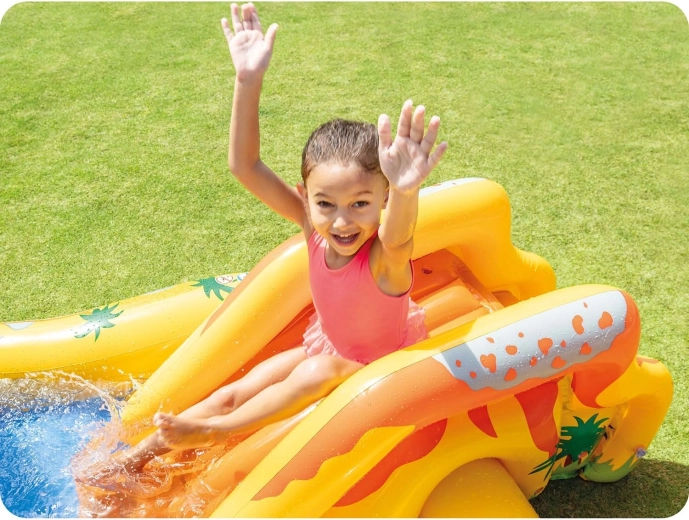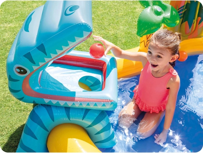 Detské vodné ihrisko s motívom dinosaurov prináša množstvo herných možností: plytký bazénik na bezpečné čľapkanie, nafukovaciu šmýkačku s mäkkým dojazdom a vodnú spršku z palmy či listu, ktorá osvieži v letných horúčavách. Veľký nafukovací dinosaurus navyše láka k hre s loptičkami – kŕmte ho a trénujte presnosť.