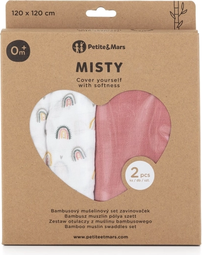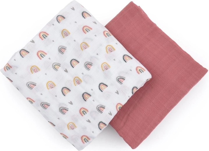 Veľkorysý rozmer 120 × 120 cm uľahčuje zavinovanie a rozširuje možnosti použitia doma aj na cestách. Sada obsahuje jeden kus v nežnom odtieni Misty Rose a jeden s veselým motívom dúhy a srdiečok – praktický aj štýlový doplnok výbavičky.