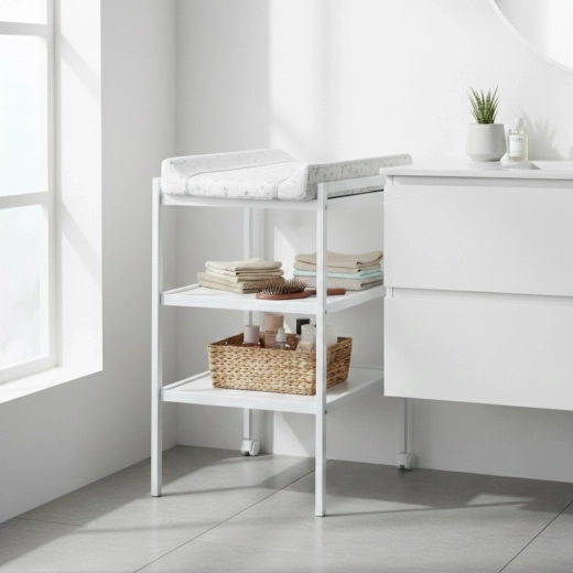 Dve otvorené police ponúknu dostatok úložného priestoru na plienky, kozmetiku a oblečenie, aby ste mali všetko na dosah. Praktické kolieska na dvoch nohách umožnia ľahké presunutie pultu podľa potreby, pričom ergonomická výška prispieva k väčšiemu pohodliu chrbta pri každodennom používaní.