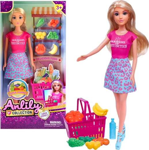 Táto pôvabná bábika v krásnom oblečení je pripravená na nákupy v farebnom stánku s ovocím a zeleninou. Deti môžu nakupovať, triediť a prenášať potraviny v priestrannom košíku, pričom si prirodzene osvojujú základné princípy zdravého stravovania.