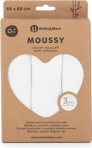 Sada PETITE&MARS Moussy Total White prináša trojicu nadýchaných mušelínových plienok zo 70 % bambusu a 30 % bavlny. Vďaka jemnej, vzdušnej väzbe sú šetrné aj k tej najcitlivejšej pokožke novorodencov a výborne sajú. Využijete ich doma aj na cestách – ako uteráčik, osušku na maznanie, podložku, podbradník či plienku na odgrgnutie.