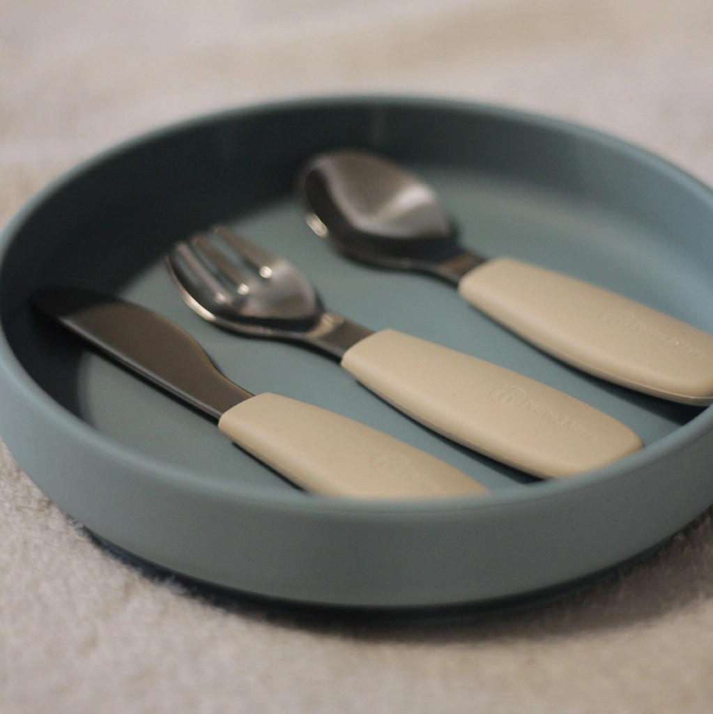 Štýlová sada detských príborov Petite&Mars z kolekcie Take&Match je ideálna na prvé samostatné jedenie od 12 mesiacov. Obsahuje lyžičku, vidličku a bezpečný nôž z nehrdzavejúcej ocele s ergonomickými protišmykovými rukoväťami z potravinárskeho silikónu. Zaoblené hrany pre bezpečnosť, moderný dizajn v odtieni Velvet Latte a jednoduché čistenie v umývačke robia z tejto sady praktického pomocníka na každý deň.