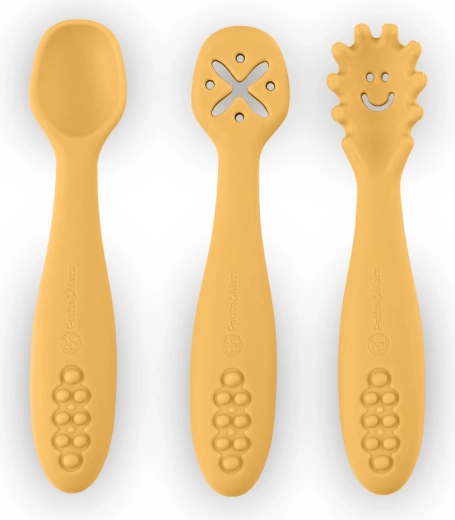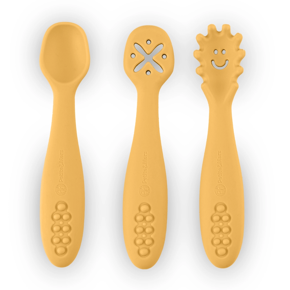 Set PETITE&MARS TAKE&MATCH v odtieni Intense Ochre je navrhnutý tak, aby deťom od 6 mesiacov pomohol zvládnuť prvé príkrmy aj pokročilejšie samokŕmenie. Tri odlišné lyžičky podporujú motoriku, vnímanie tvarov a textúr a prinášajú istotu vďaka kontrolovanému naberaniu. Mäkké špičky sú šetrné k citlivým detským ústam a krátke, protišmykové rukoväte padnú do malej detskej rúčky.