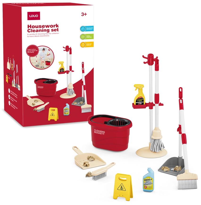 Súčasťou sady je praktický mini mop, metla a ďalšie užitočné pomôcky, ktoré napodobňujú skutočné nástroje. Deti tak pochopia, aké je dôležité udržiavať poriadok, a zároveň si precvičia koordináciu a samostatnosť.