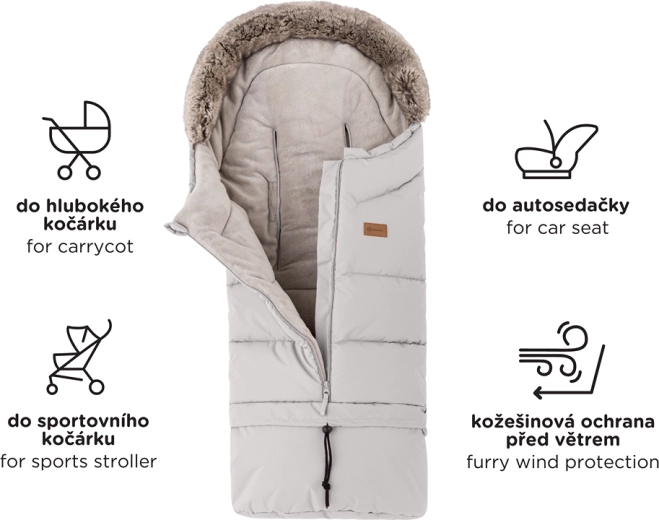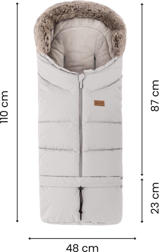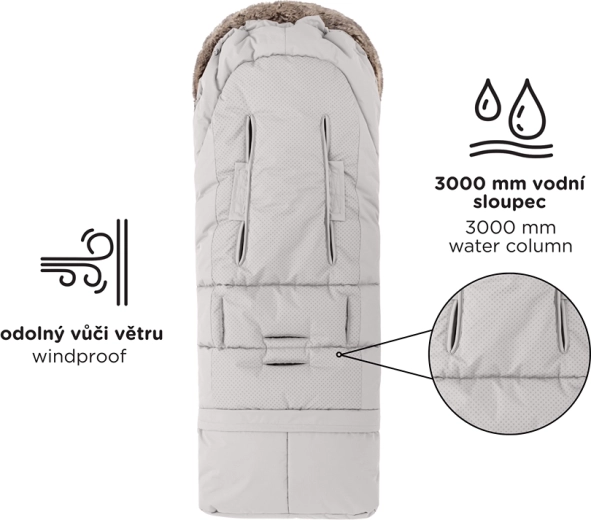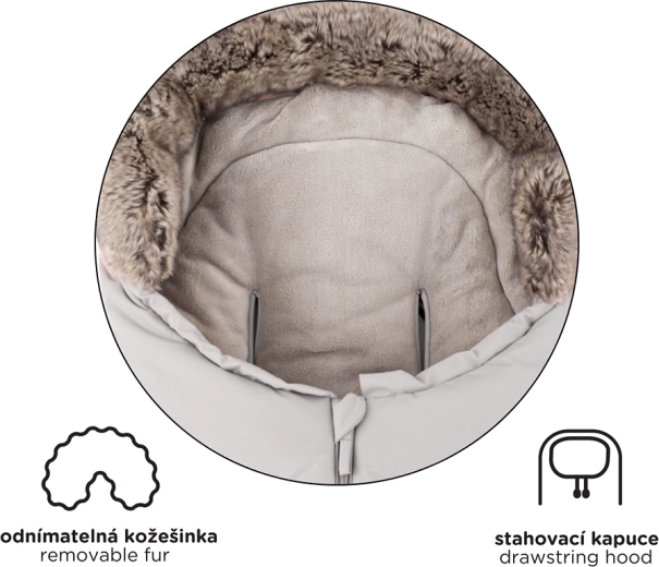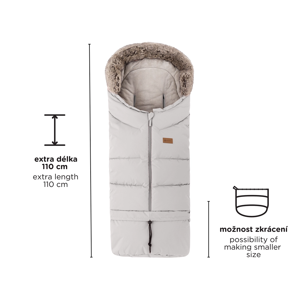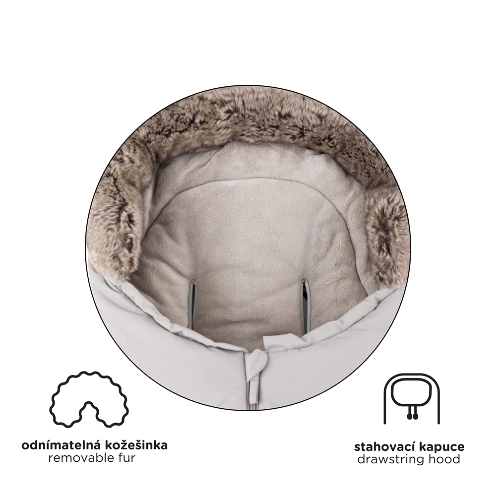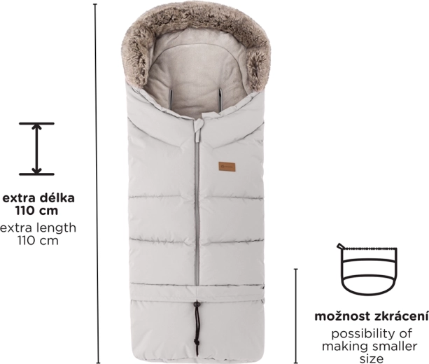 Fusak ľahko skrátite odopnutím spodnej časti pre hlboký kočík či autosedačku, v plnej dĺžke 110 cm je ideálny do športového kočíka. Kožušinový golier slúži ako ochrana proti vetru.