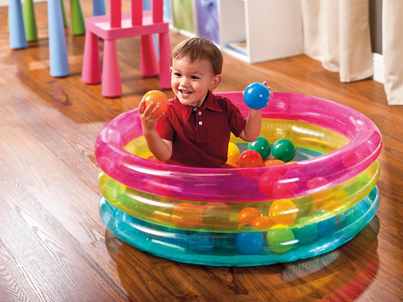 Balenie obsahuje 50 farebných loptičiek (Ø 6,5 cm), s ktorými ľahko vytvoríte obľúbený suchý bazénik. Priesvitné steny umožnia rodičom mať deti neustále na očiach. Kvalitný PVC materiál a priložená opravná záplata zaistia dlhú životnosť a jednoduchú údržbu.