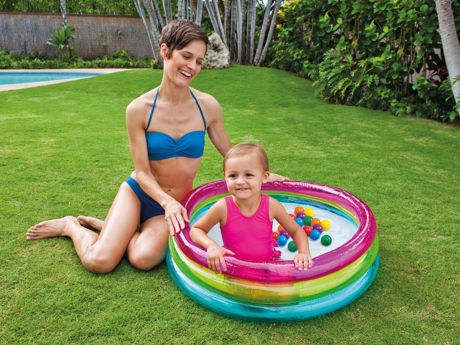 Súčasťou je 50 loptičiek (Ø 6,5 cm) v živých farbách – ideálne na vytvorenie suchého bazénika po celý rok.