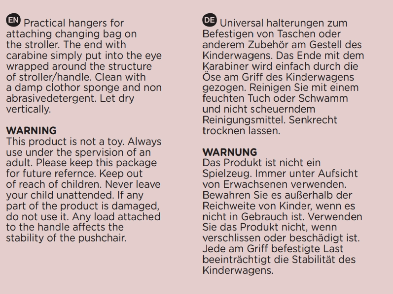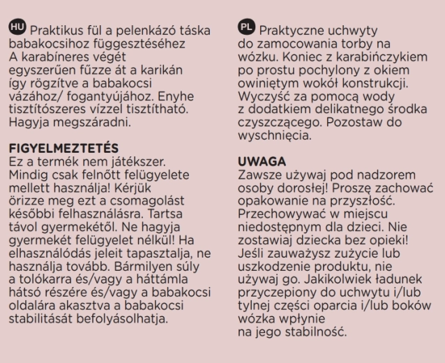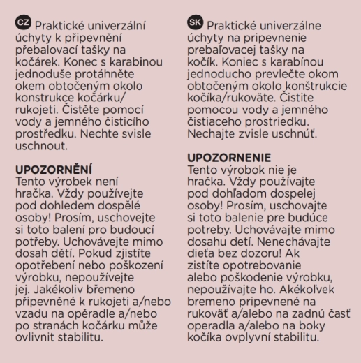 - Nepreťažujte rukoväť kočíka; zavesené bremeno môže ovplyvniť stabilitu. Výrobok nie je hračka. Používajte pod dohľadom dospelej osoby. V prípade opotrebovania či poškodenia nepoužívajte.