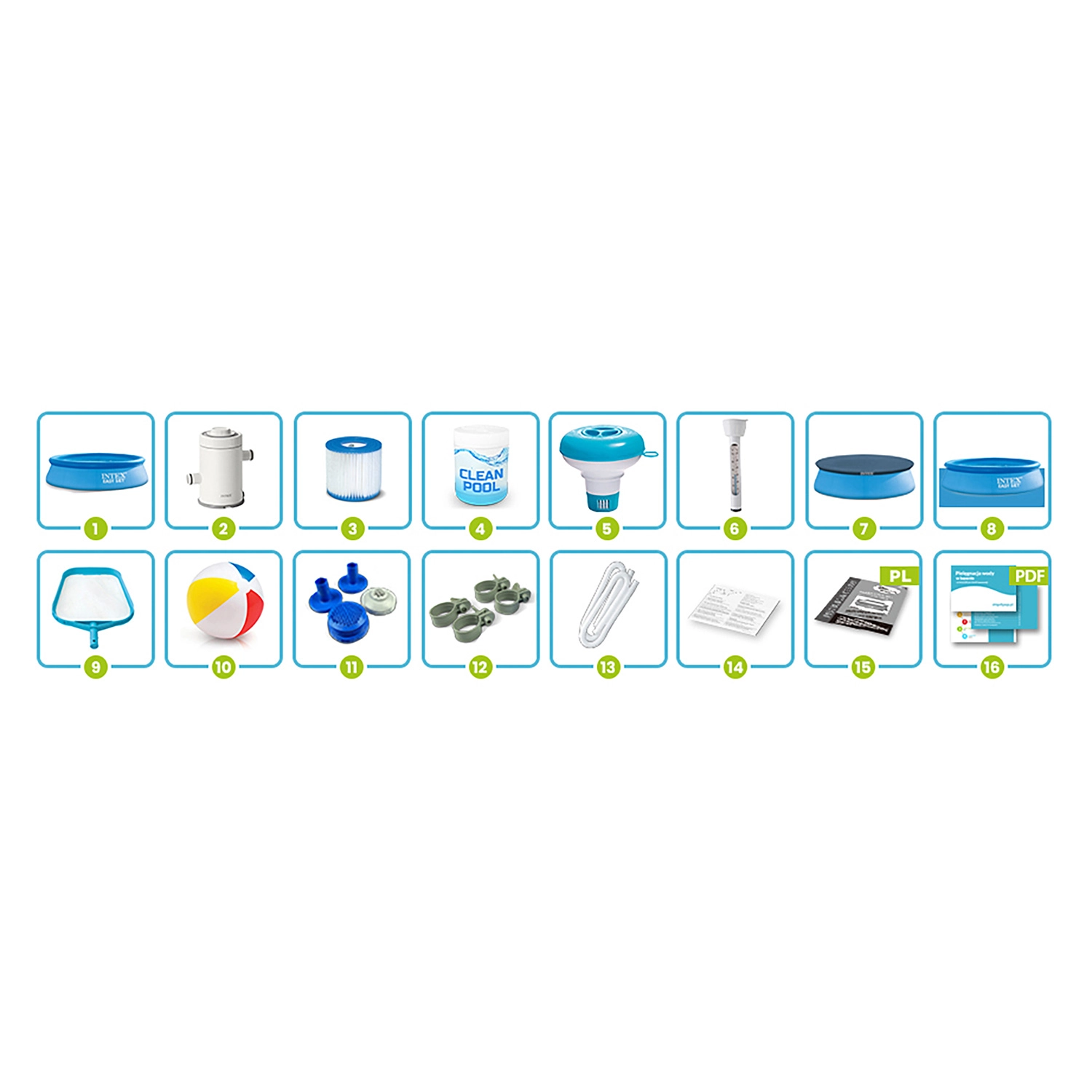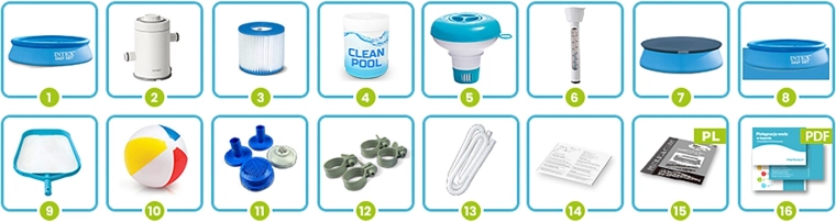 - Bazén, filtračná pumpa, filter H, multitablety, dávkovač chémie s teplomerom, kryt, podložka, sieťka, hadice a spony, sacie koše, plážová lopta, návod, opravná záplata