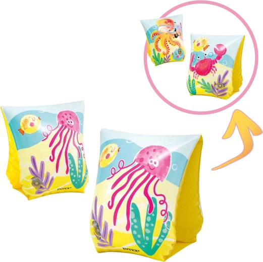 Žlté prevedenie s chobotnicou, krabom a medúzou zvyšuje viditeľnosť dieťaťa vo vode a dodáva plávaniu zábavnejší vzhľad.