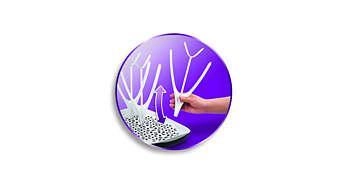 Stojan na sušenie Philips Avent je navrhnutý tak, aby zaistil rýchle a prehľadné sušenie všetkých každodenných potrieb na kŕmenie dieťaťa. Vďaka šikovnému rozmiestneniu kolíkov pojme až 8 fliaš, savičky, krúžky, diely odsávačky aj ďalšie doplnky. Odnímateľný podnos zachytáva odkvapkanú vodu a udržiava pracovnú plochu suchú a čistú.