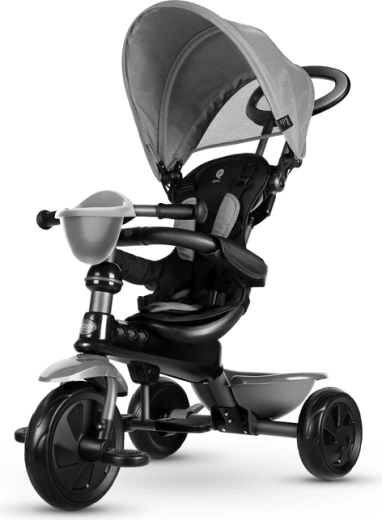 Trojkolka sa vyvíja v 4 krokoch: od plne ovládaného režimu rodičom až po samostatnú jazdu s pedálmi. Odnímateľné diely (opierka chrbta, rodičovská rukoväť, opierky/pedále) umožnia ideálne nastavenie pre každú fázu rastu. Praktický predný košík na fľašu a zadný košík poskytnú priestor na hračky a drobnosti, zadná nožná brzda zaistí bezpečné parkovanie.