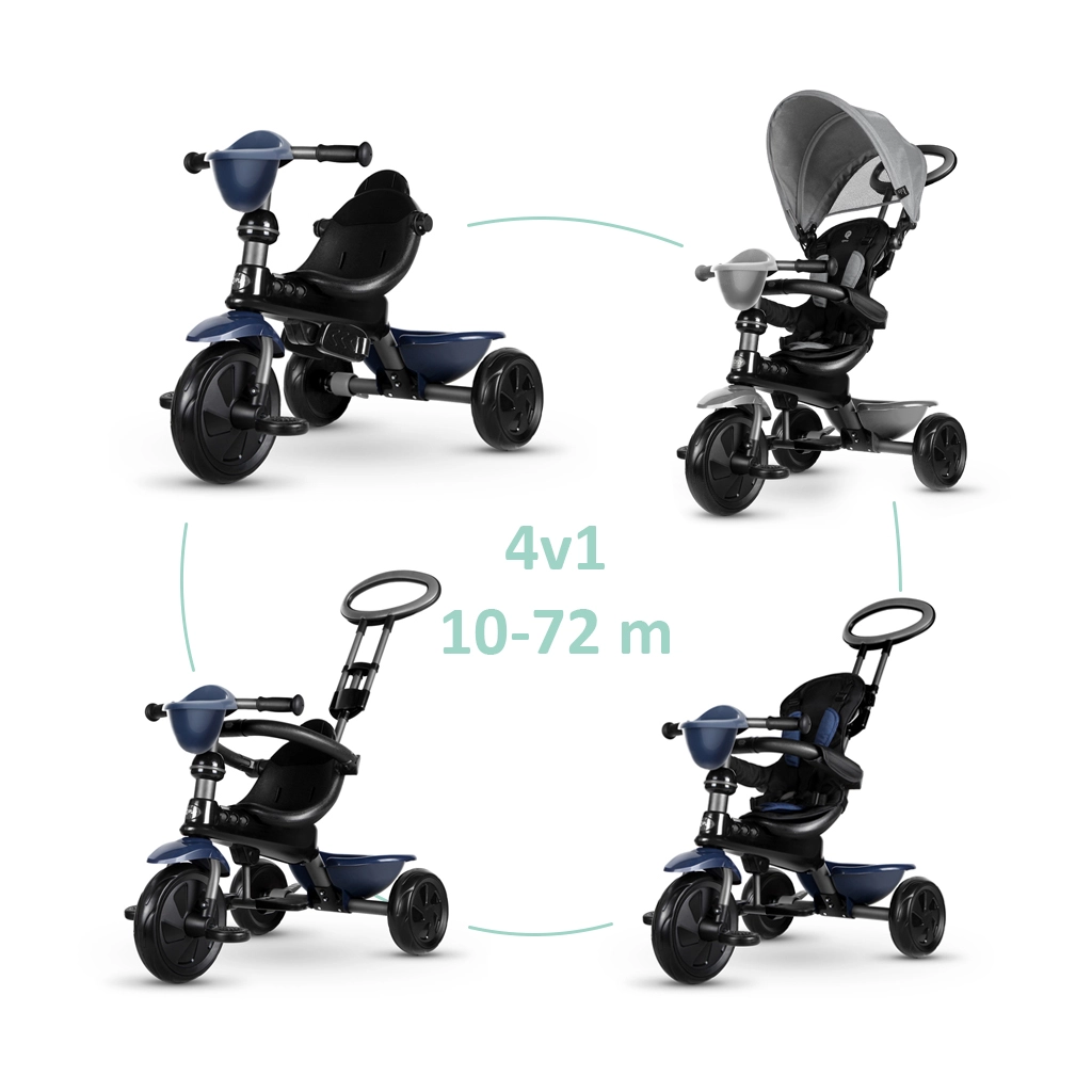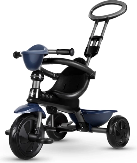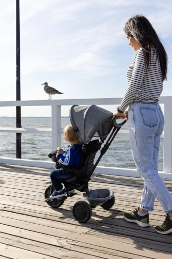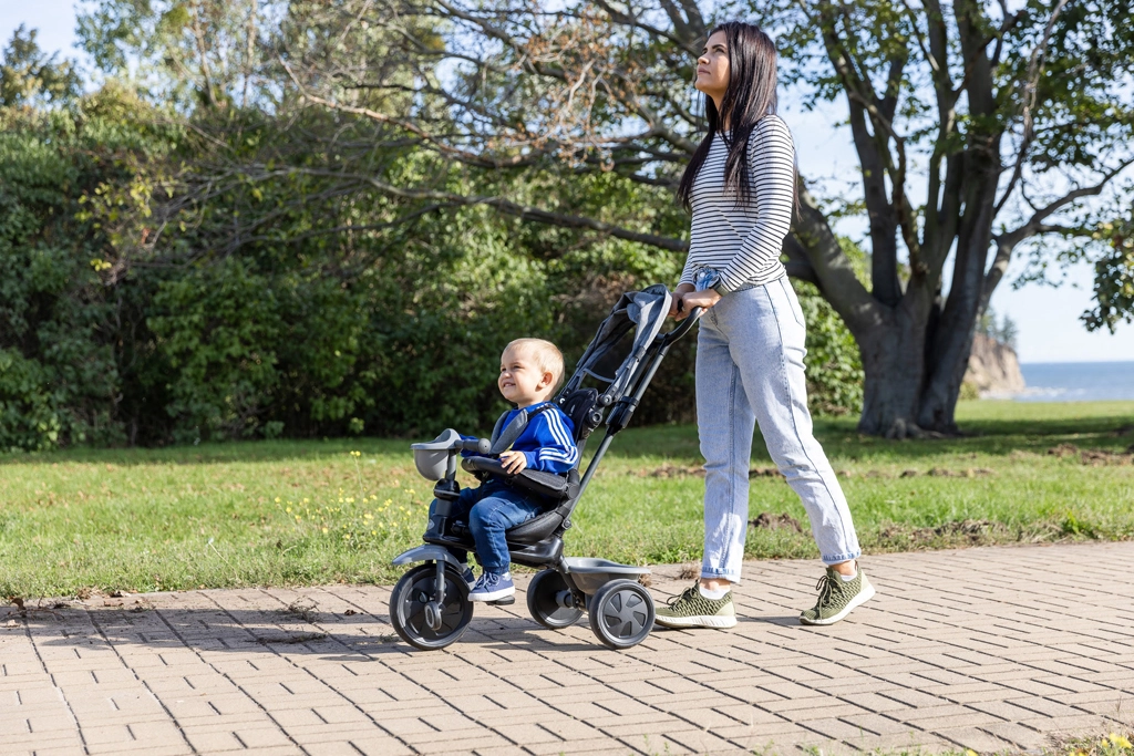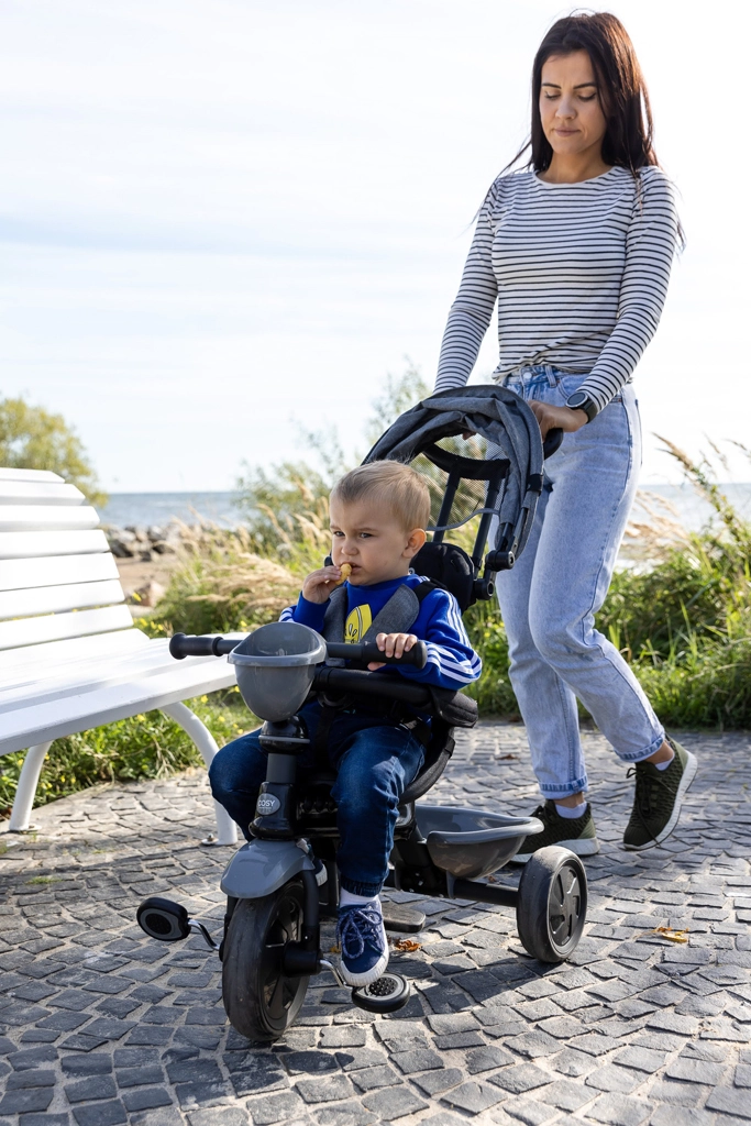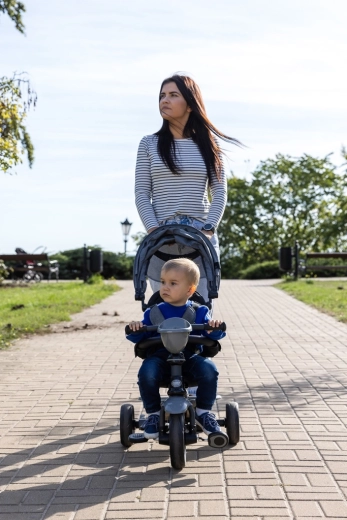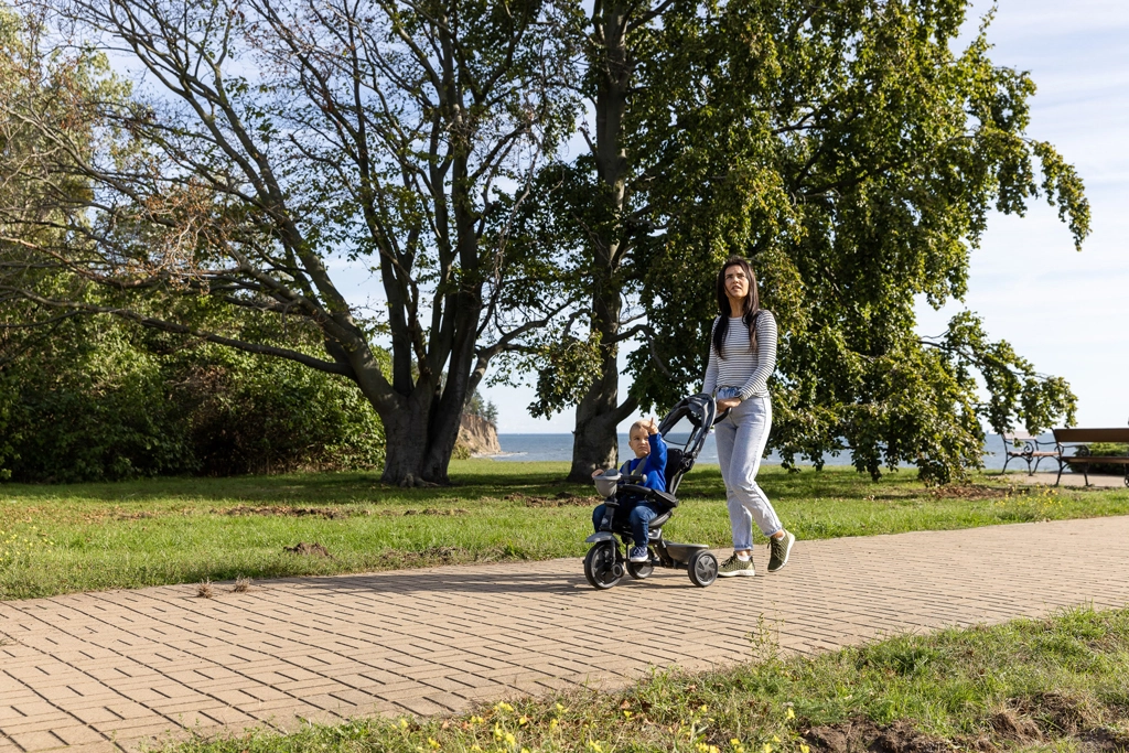 Vďaka odnímateľným a nastaviteľným častiam sa trojkolka prispôsobí rastu dieťaťa – od režimu s rodičovským vedením až po plne samostatnú jazdu.