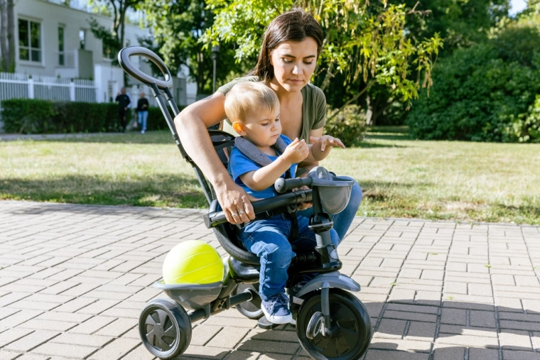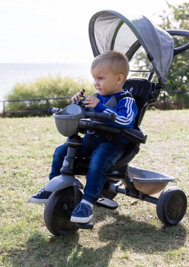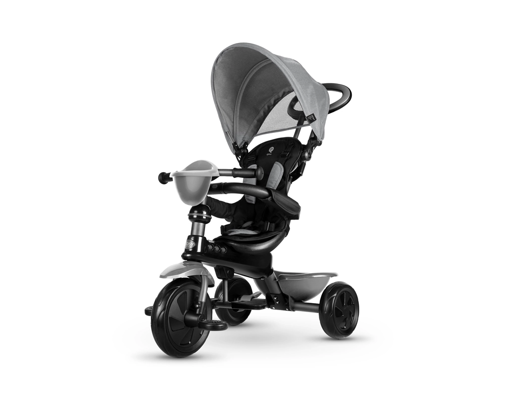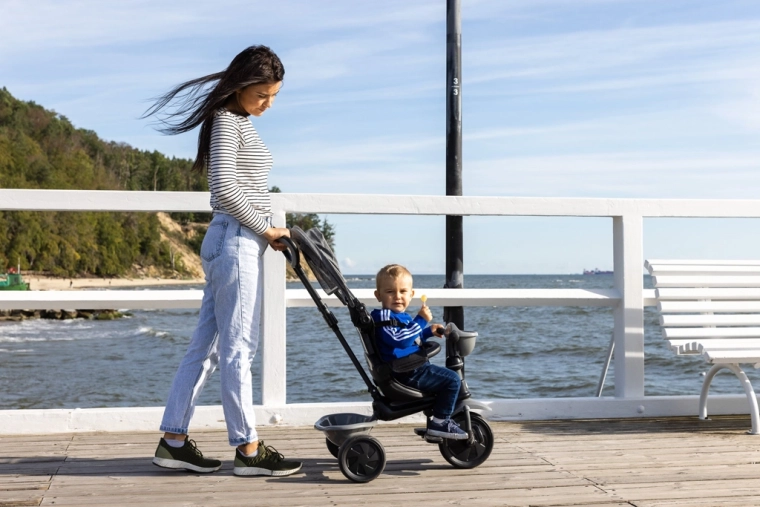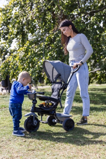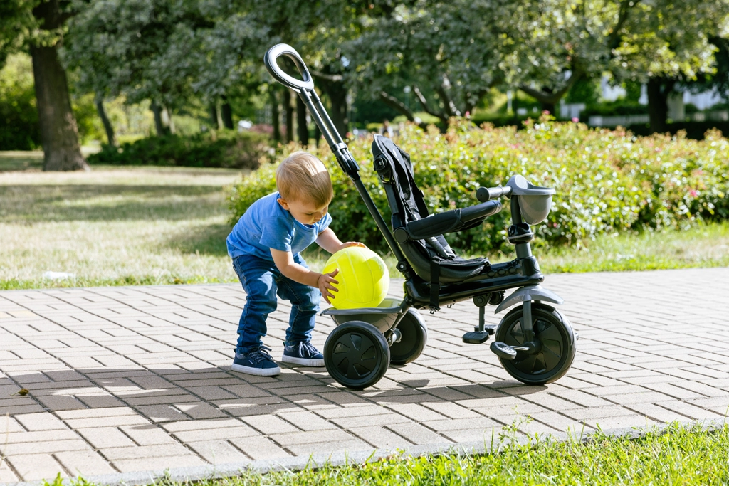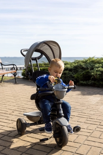 Vďaka odnímateľným a nastaviteľným častiam sa trojkolka prispôsobí rastu dieťaťa – od režimu s rodičovským vedením až po plne samostatnú jazdu.