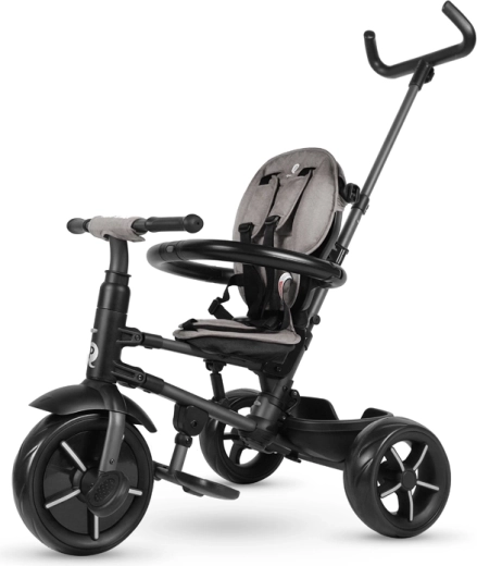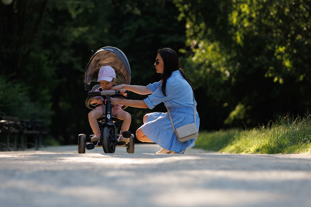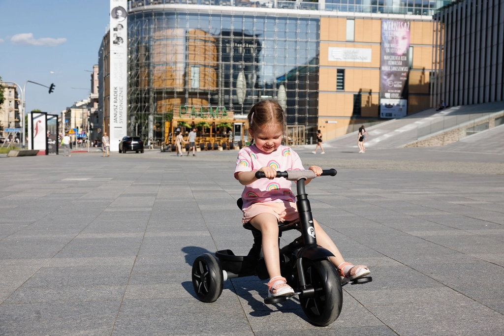 Bezpečnosť je na prvom mieste: 5-bodové pásy, odnímateľná ochranná tyč a rozšíriteľná strieška s UV ochranou UPF 50+ chránia dieťa za všetkých podmienok. Funkcie voľnobehu a uzamknutia riadenia umožnia prechod od asistovanej jazdy k samostatnému šliapaniu, zatiaľ čo sklopná opierka nôh poskytne oddych pri dlhších prechádzkach.