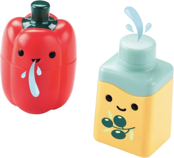 Roztomilé fľaštičky v tvare papriky a olivového oleja fungujú ako striekačky. Dvojdielna konštrukcia uľahčuje čistenie a udržiava hračky hygienické.