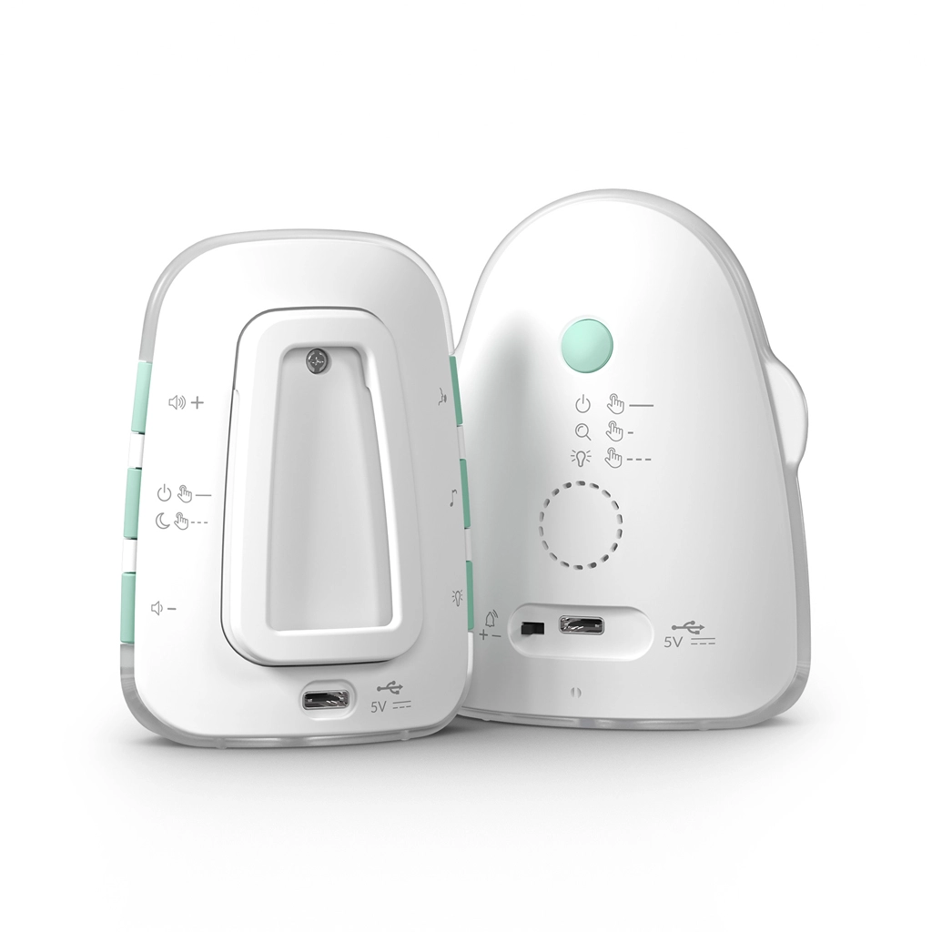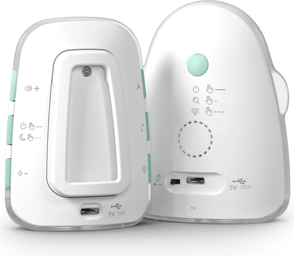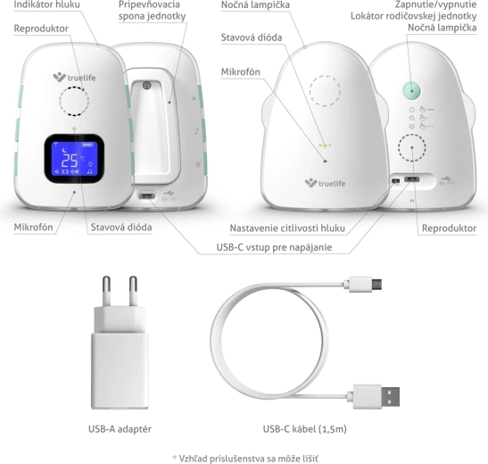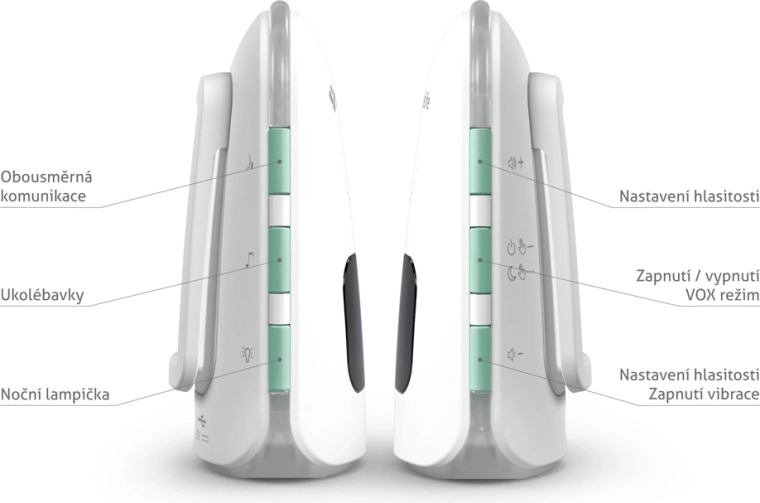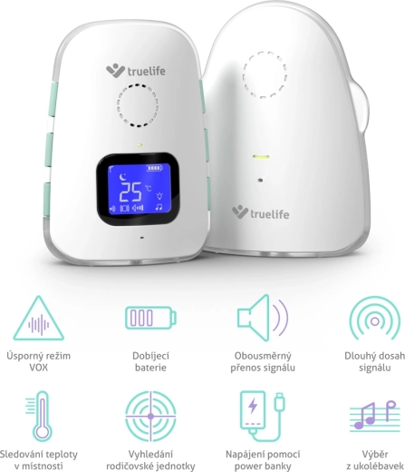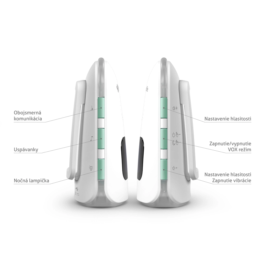 Rodičovská jednotka s LCD displejom zobrazuje teplotu, stav batérie a silu signálu. Nechýba teplotné stráženie s upozornením na nízku či vysokú teplotu, tichý režim s vibráciami, praktická nočná lampička a zvukový lokátor rodičovskej jednotky. Obe jednotky majú integrované batérie s dlhou výdržou a pohodlné nabíjanie cez USB‑C, prípadne z powerbanky.